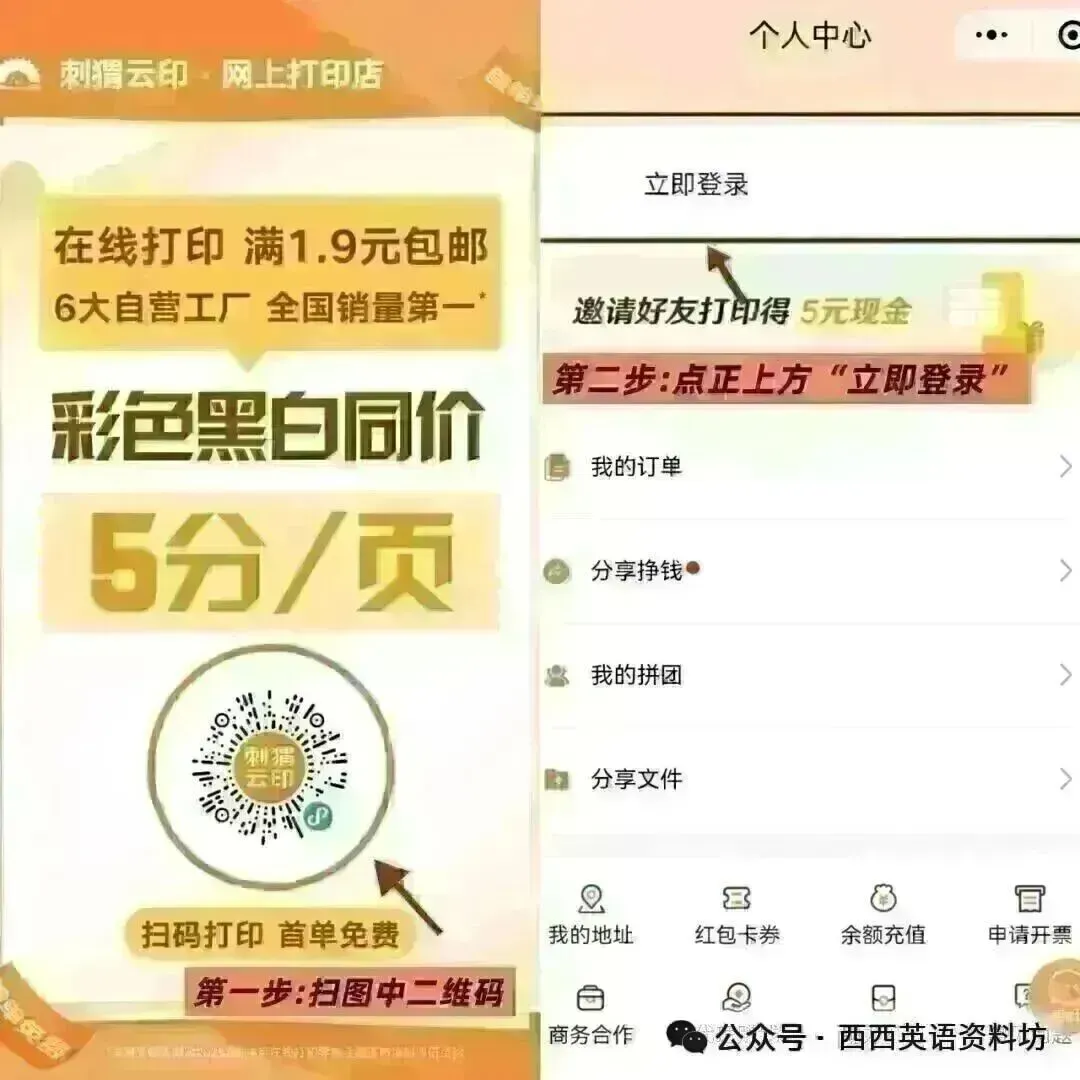 本公众号粉丝福利来啦!🔔✅黑白彩色都是5分/页(首单免费)✅ 刺猬云印现在满1.9元即可包邮啦!✅ 满2.9元可免费升级顺丰快递✅ 20点前下单,当天火速发货!👇第一步: 扫下图二维码;第二步:点正上方“立即登录”,即可一键注册下单打印哦!