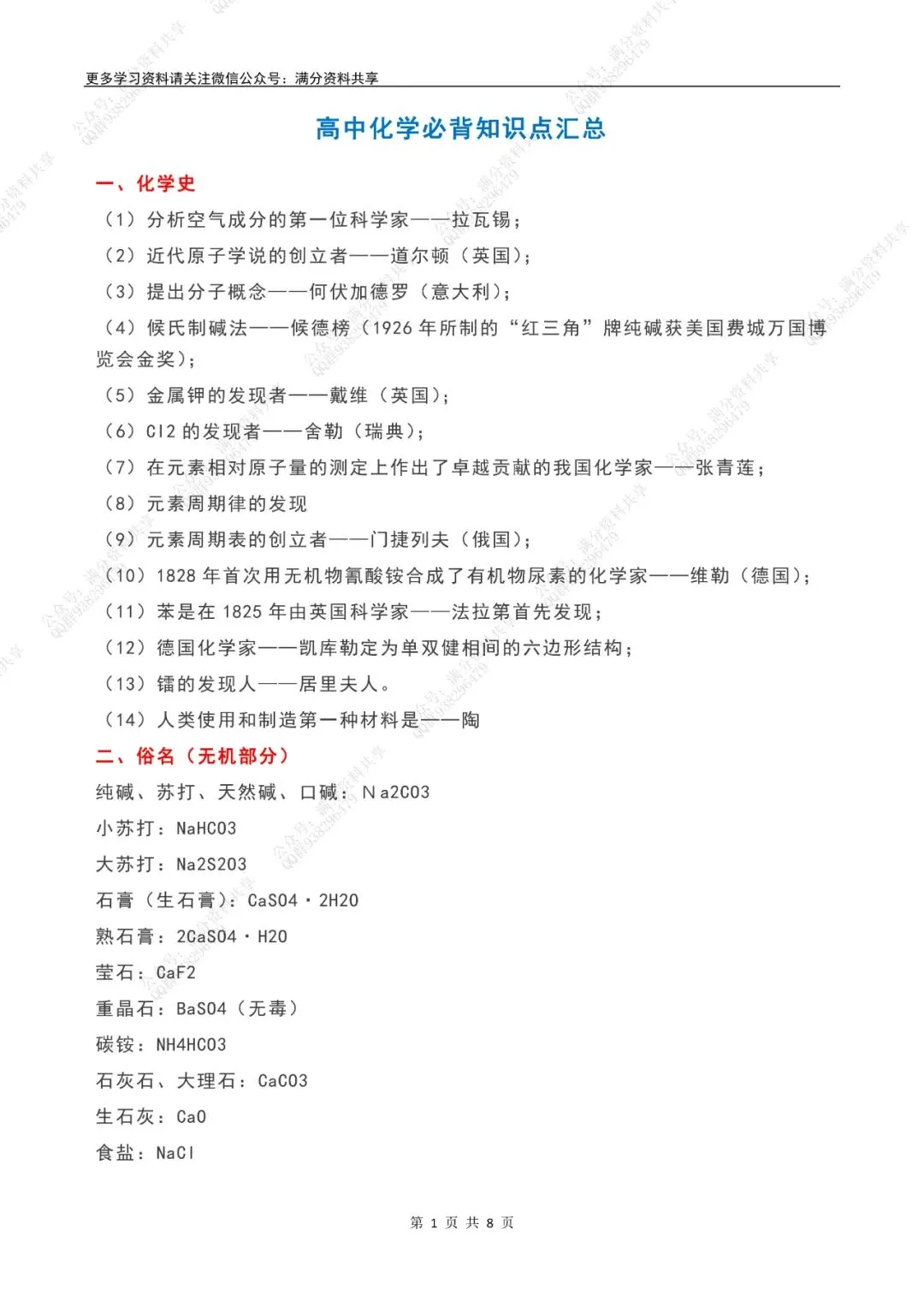 高中化学必背知识点汇总(pdf分享) 点击图片可观看高清版,文末有获取打印版方式 领取完整电子版: ①:点一点右下角的“赞”和“在看”,感谢! ②:点击“关注”回复“高中资料”获取资料 点击下方“公众号”关注,可以进入主页哦!
