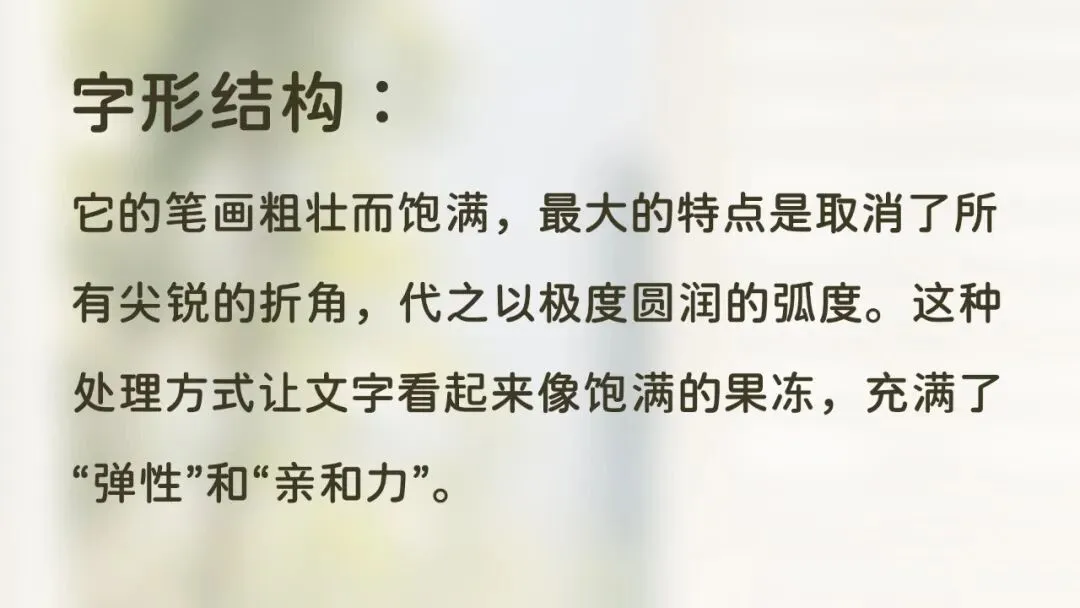 字形结构: 它的笔画粗壮而饱满,最大的特点是取消了所有尖锐的折角,代之以极度圆润的弧度。这种处理方式让文字看起来像饱满的果冻,充满了“弹性”和“亲和力”。