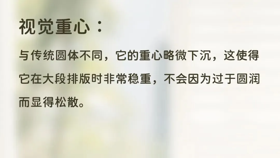 视觉重心: 与传统圆体不同,它的重心略微下沉,这使得它在大段排版时非常稳重,不会因为过于圆润而显得松散。