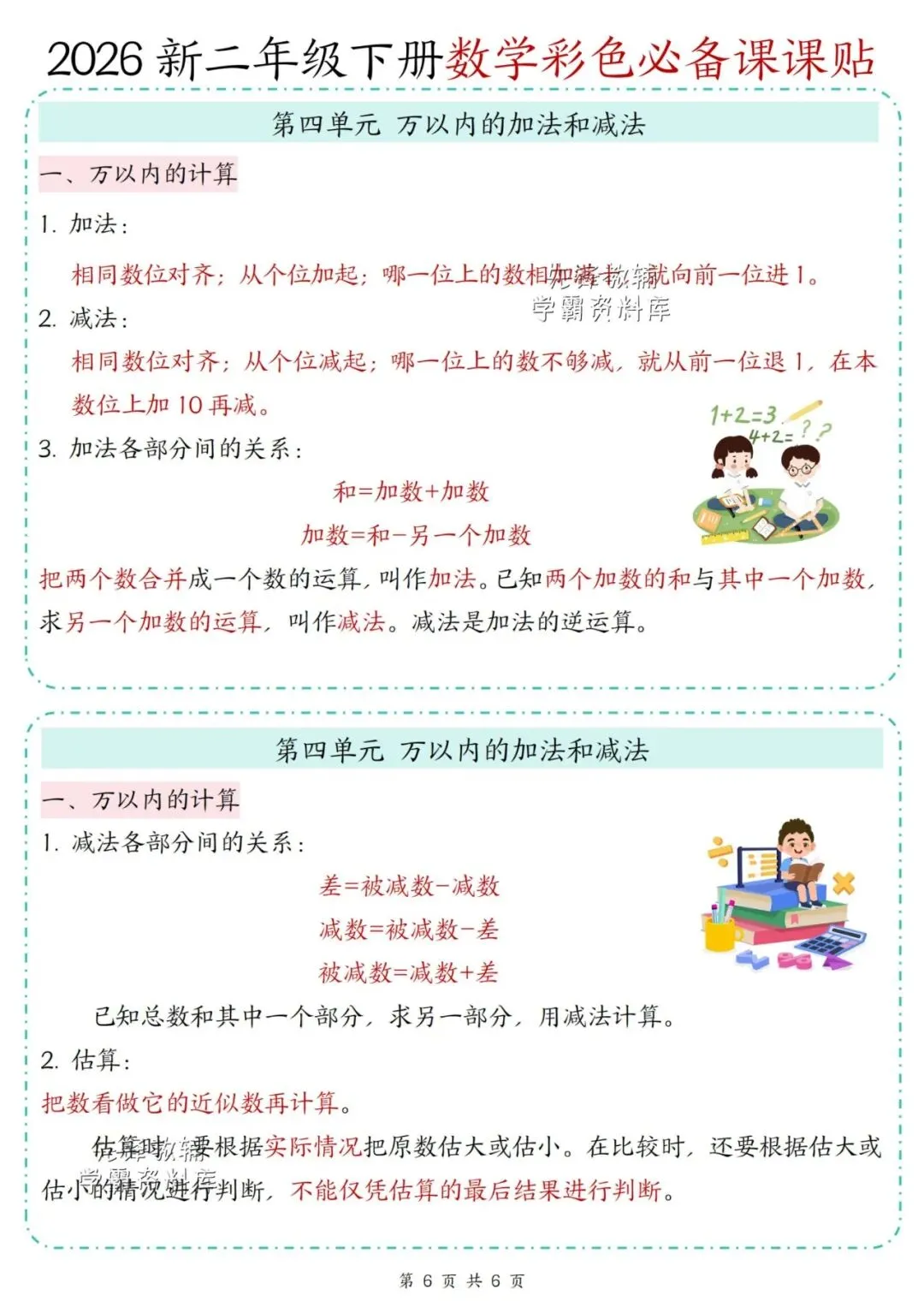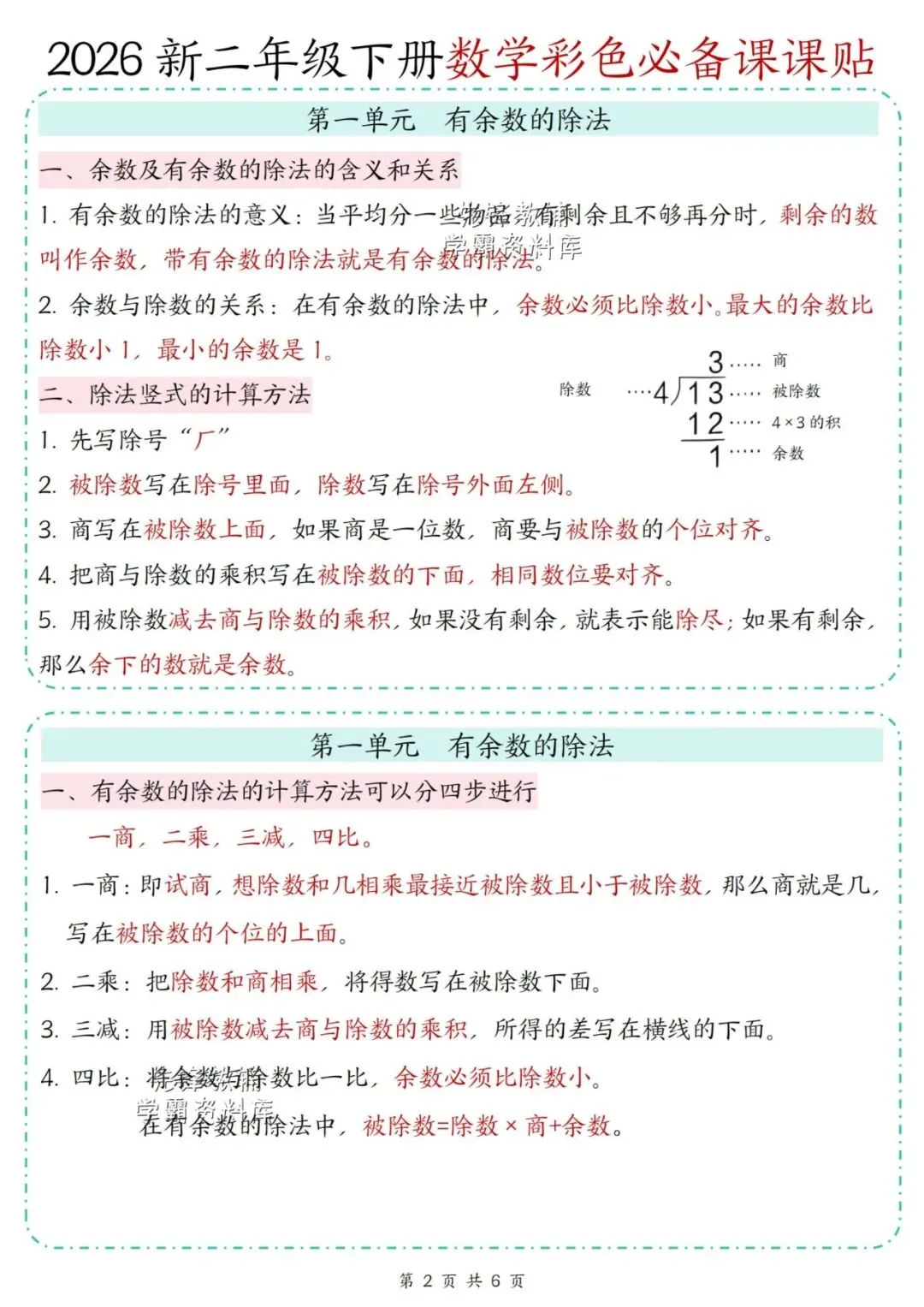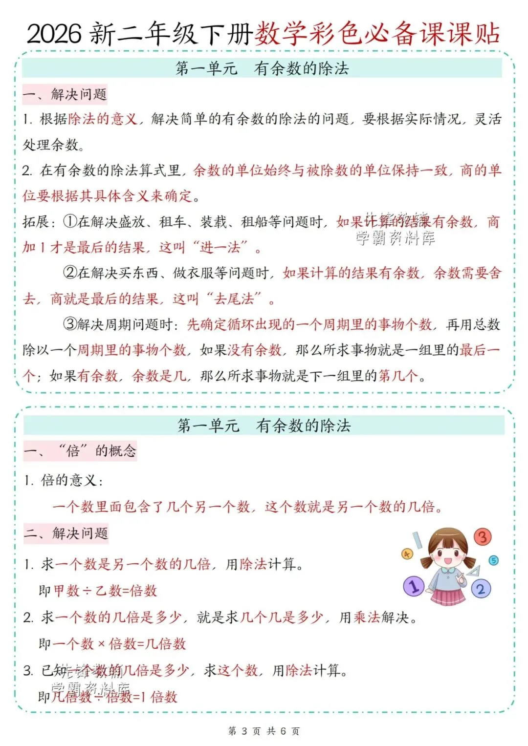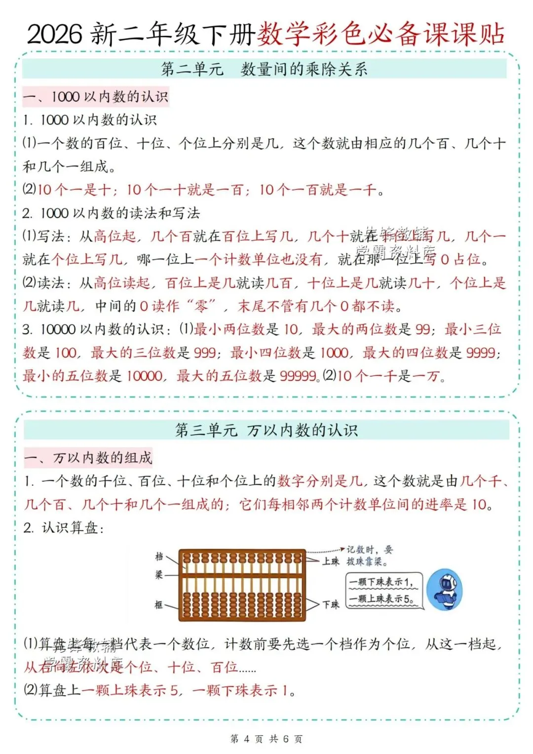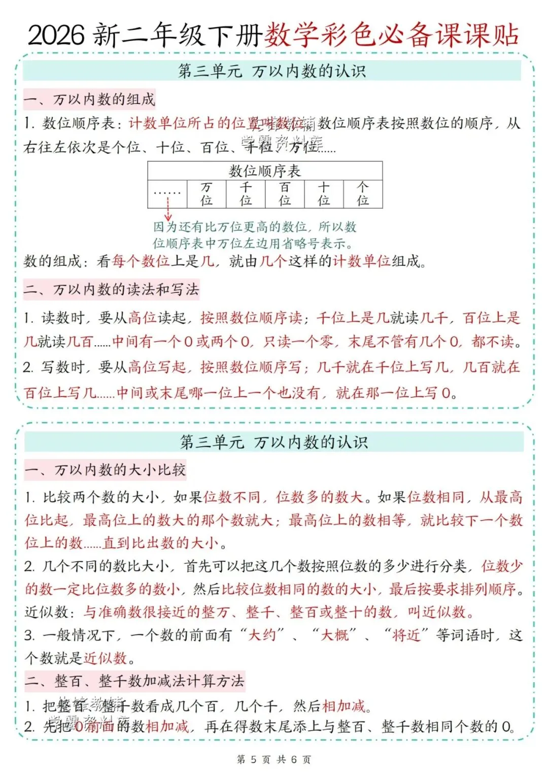 26年春二年级下册数学《彩色版必备课课贴》电子版可打印,这份26年春二年级下册数学《彩色版必备课课贴》》,包含了二年级下册数学每节课的重要知识点,适合贴在课本每一页,课后巩固每节课所学的重要考点。需要的家长打印下来每天给孩子背诵一下,做到考试不丢分。