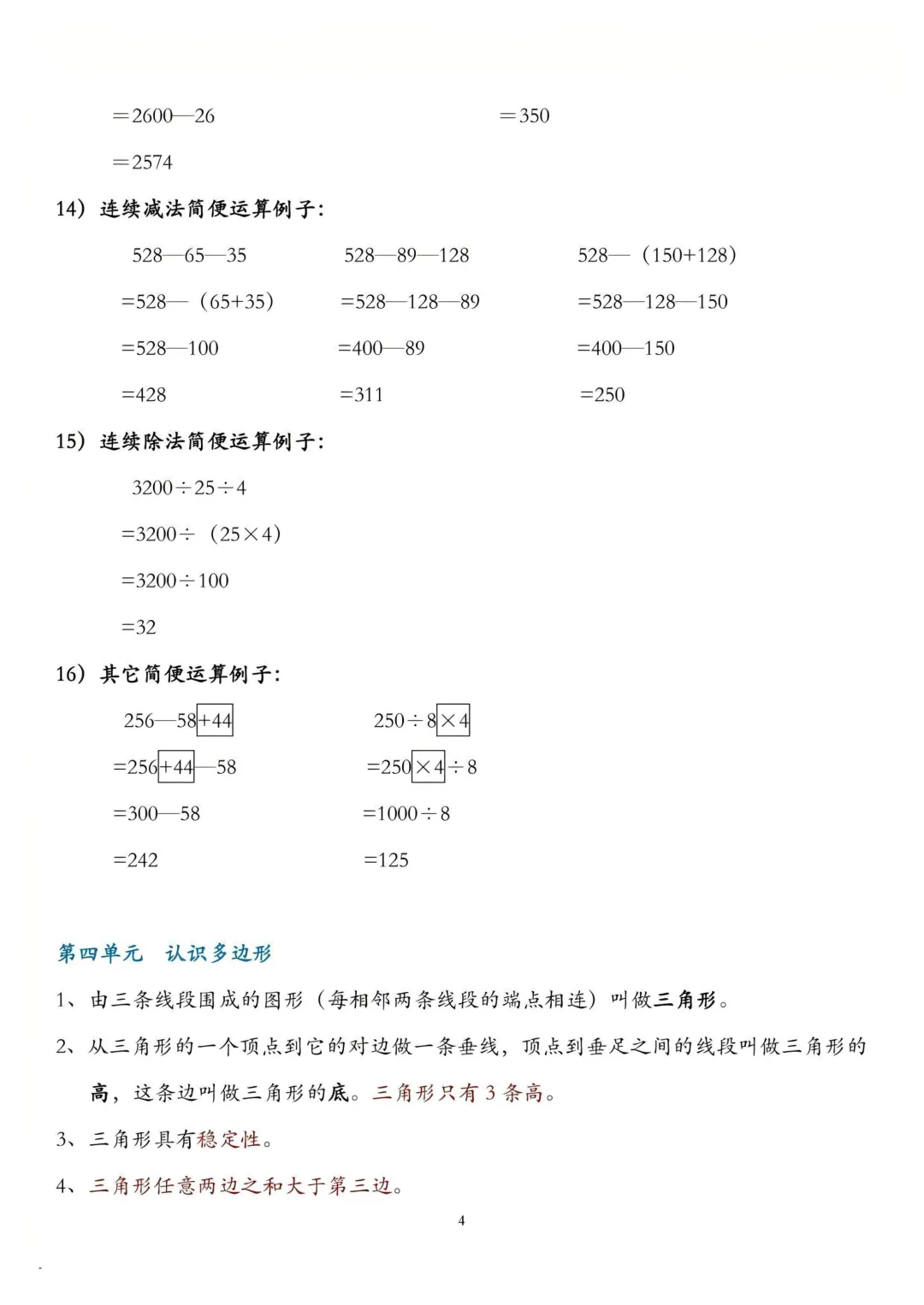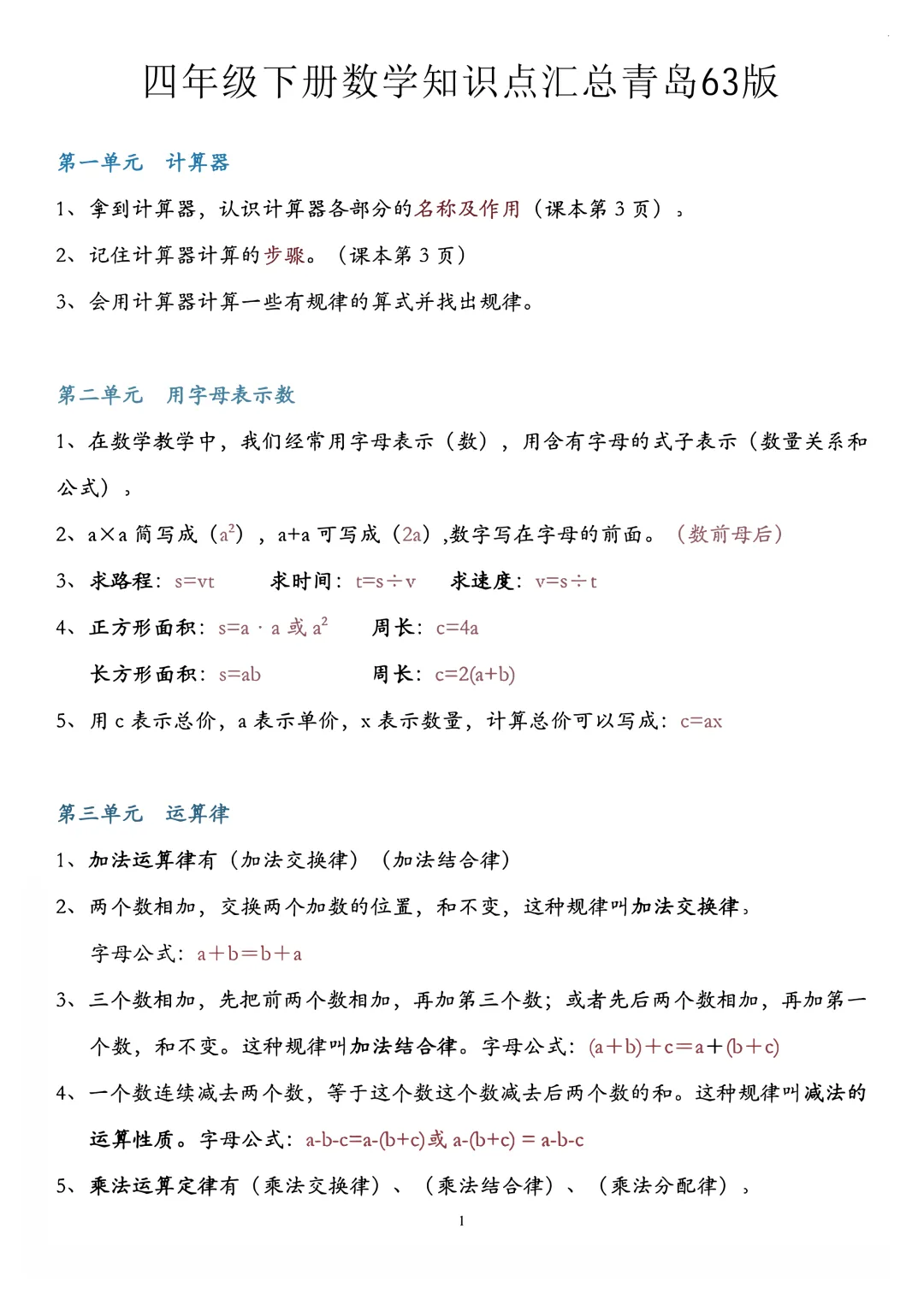 26春四年级下册青岛六三版《数学知识点汇总》,共8页,电子版可打印!