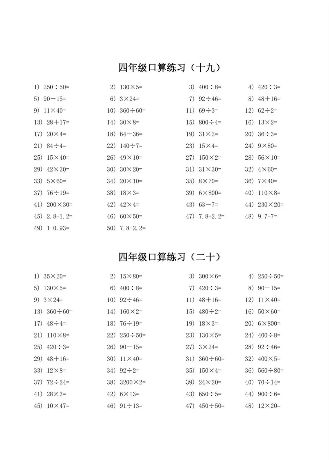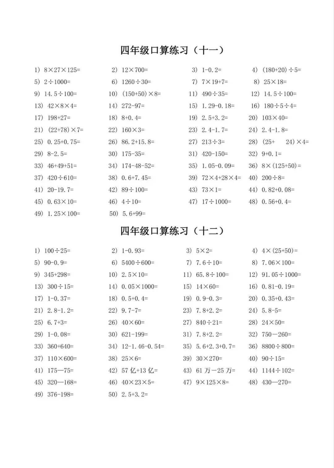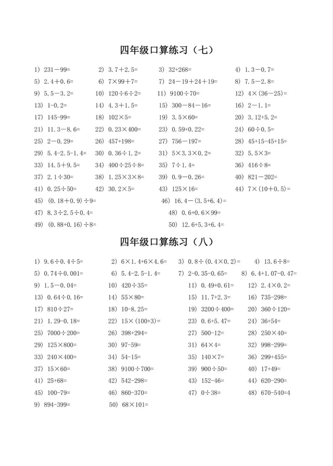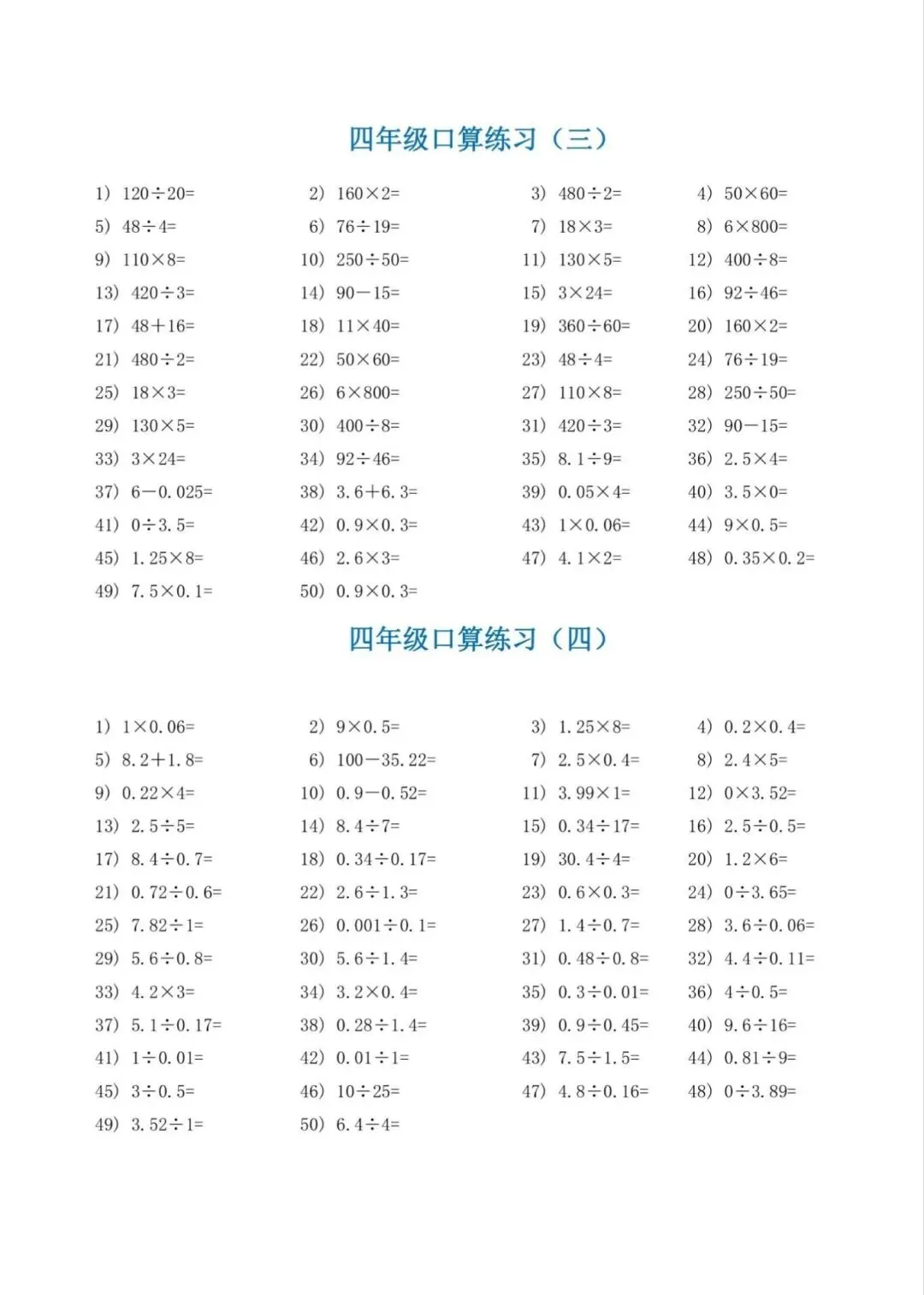 四年级下册数学口算练习题每日一练(共3000道),这份四下数学口算专项练习题,包含了小数运算、加减乘除等题型,让孩子坚持每天练一练,能够提高孩子的数学计算和口算能力,更加熟练地掌握运算规则。需要的家长抓紧打印出来,让孩子练一练吧。