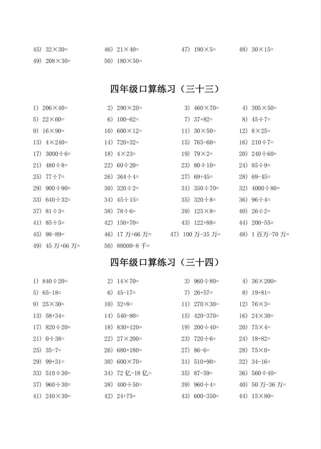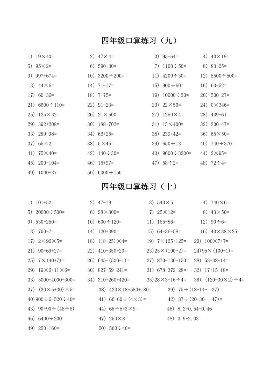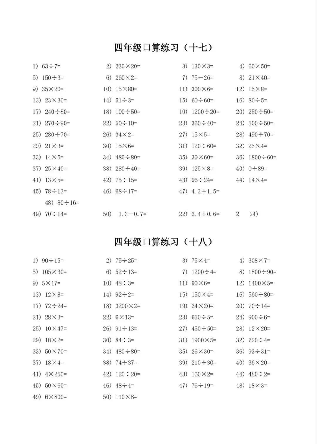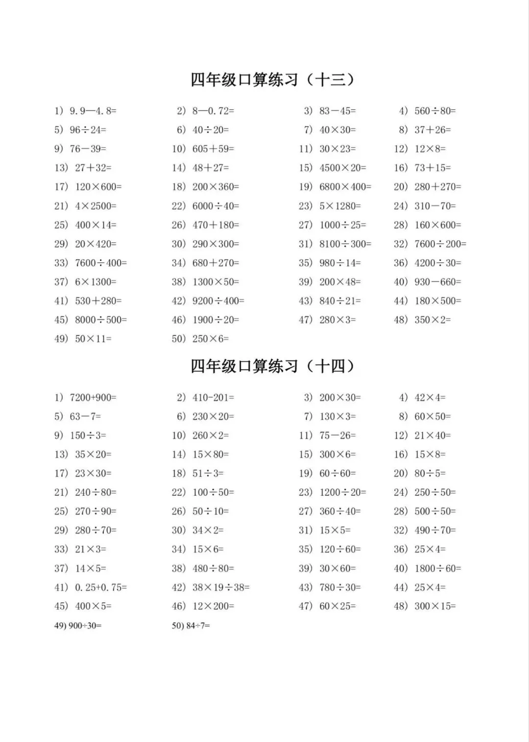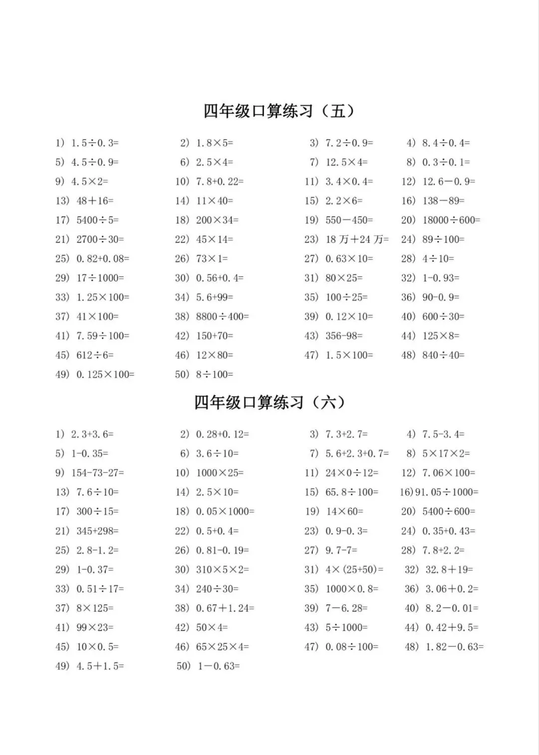 四年级下册数学口算练习题每日一练(共3000道),这份四下数学口算专项练习题,包含了小数运算、加减乘除等题型,让孩子坚持每天练一练,能够提高孩子的数学计算和口算能力,更加熟练地掌握运算规则。需要的家长抓紧打印出来,让孩子练一练吧。