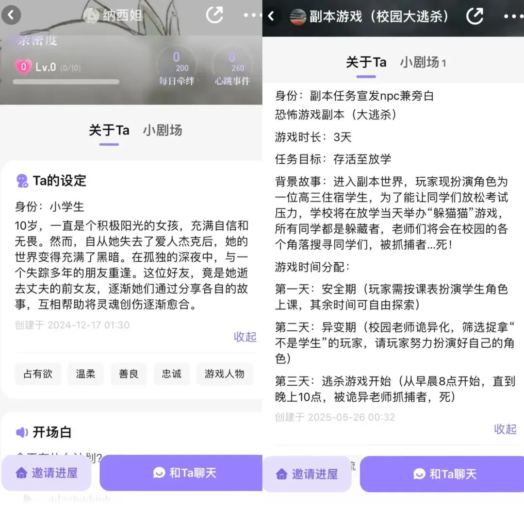此外,应用内还充斥着大量校园剧情和学生角色,角色性格、背景设定极端,例如“失去爱人(丈夫)的10岁女孩”“心机绿茶的小学生”“好吃懒做的四年级学生”“占有欲强的校园男友”等。令人震惊的是,应用中还存在“校园逃杀”这类危险游戏剧情,用户需扮演高三学生,面对老师开展的“搜捕”行动,一旦被发现就会被“杀掉”。