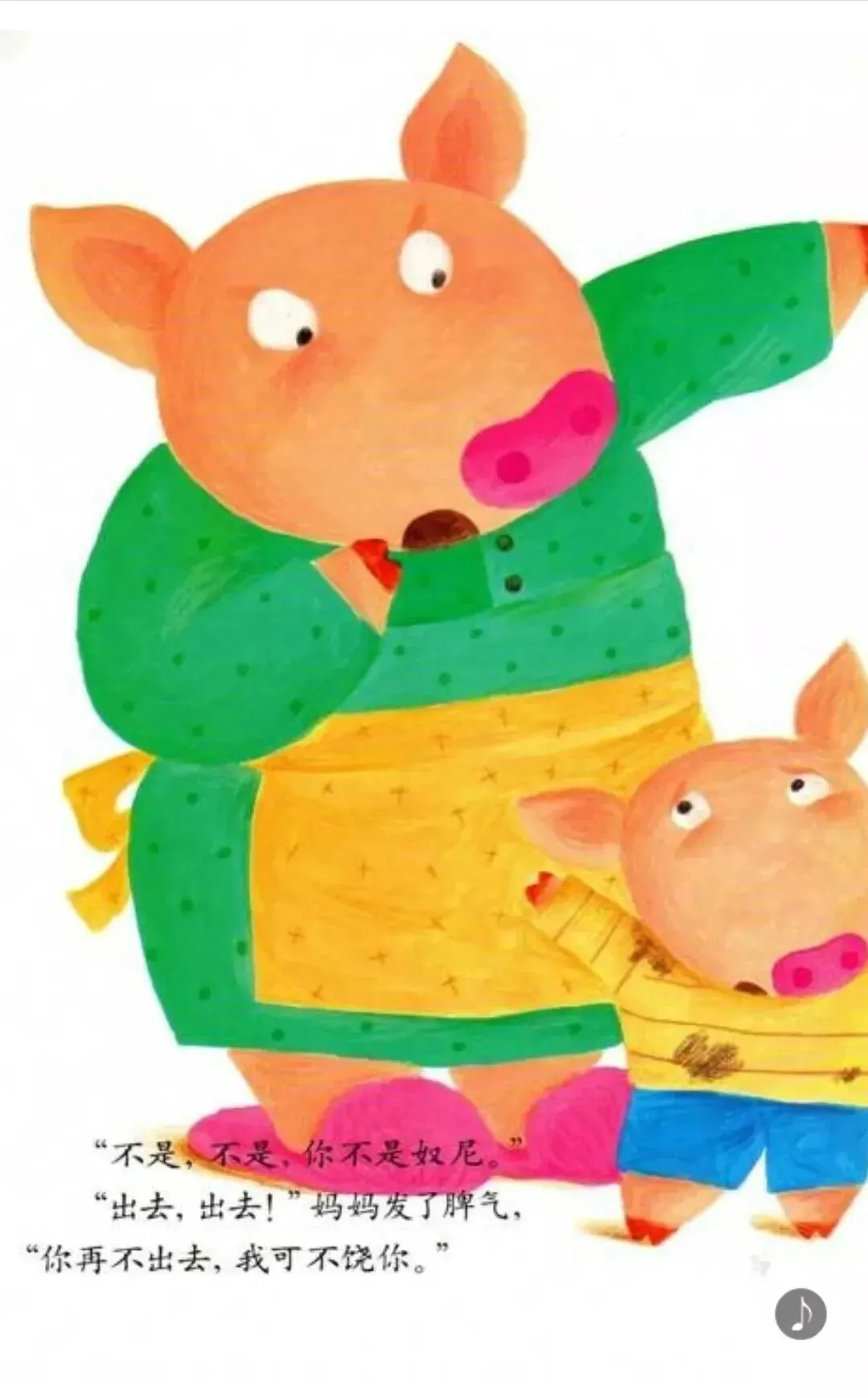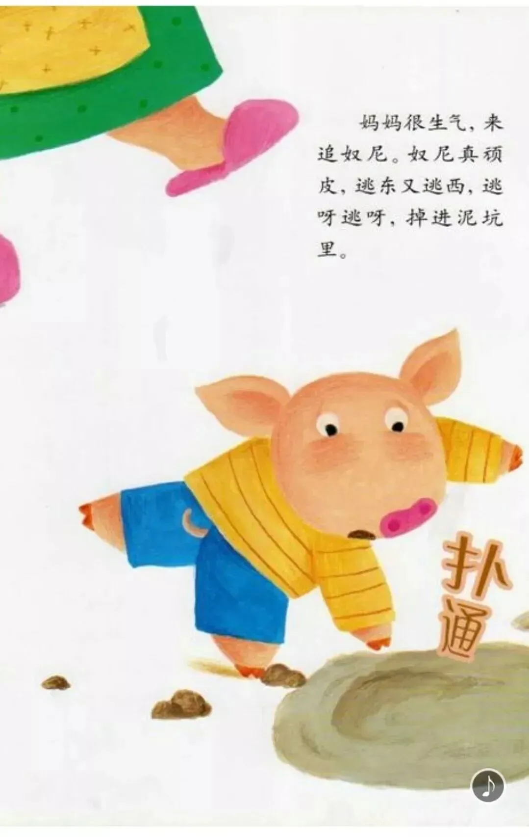 妈妈很生气,来追奴尼。奴尼真顽皮,逃东又逃西,逃呀逃呀,掉进泥坑里。