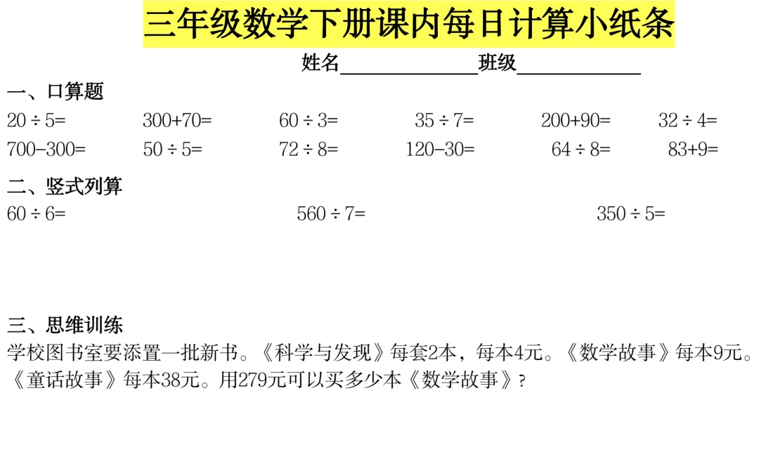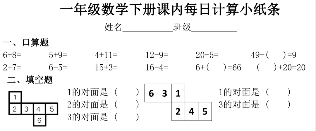 26年春小学数学下册数学计算小纸条,免费下载