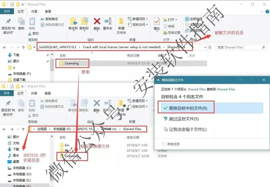 19.将文件夹“Licensng”进行复制,粘贴ANSYS 19.2安装根目录下,并替代源文件覆盖同名文件(前面定义的安装路径),破解完成。如果复制替换licensing文件夹没有激活,那就打开licensing文件夹复制里面的内容,粘贴到软件安装位置的licensing文件夹里,复制替换同名文件夹。