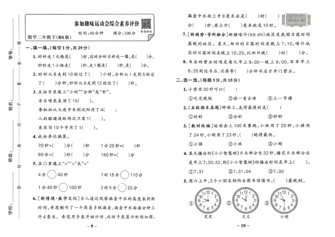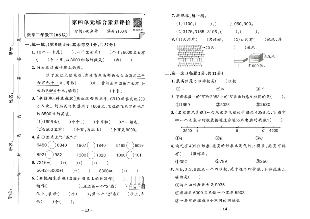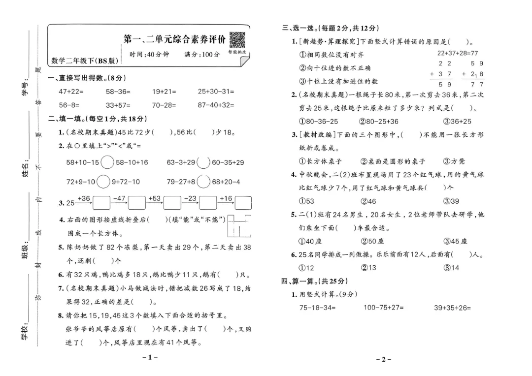 26年春新版二年级下册北师大版数学 《1-7单元素养达标卷+期中期末测试卷》(共10套含答案)可打印
