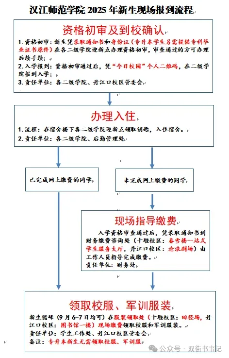 直接导航「汉江师范学院(十堰校区/丹江口校区)」,校园内有停车场(报到日车位充足,志愿者会指引停车)。下车后跟着「迎新指示牌」走,红马甲学长学姐会帮你搬行李!