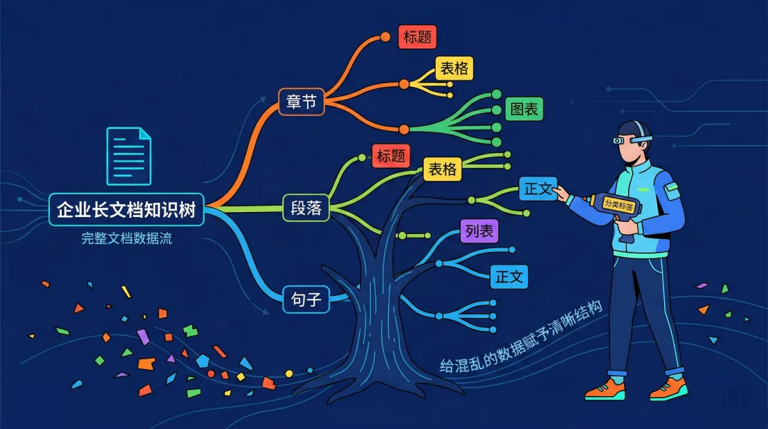 如果直接把这些乱码文件倒给大模型,它自然无法解析。所以,RAG 第一关的铁律是:必须把长篇大论的非结构化数据彻底拆解重构。
