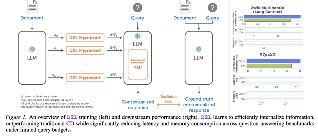 [Figure 1: D2L训练概览与下游性能] 左侧展示D2L的训练流程:超网络读取上下文的逐层token激活,生成LoRA矩阵;右侧展示在问答基准上,D2L在性能上优于传统CD,同时大幅降低延迟和显存消耗。