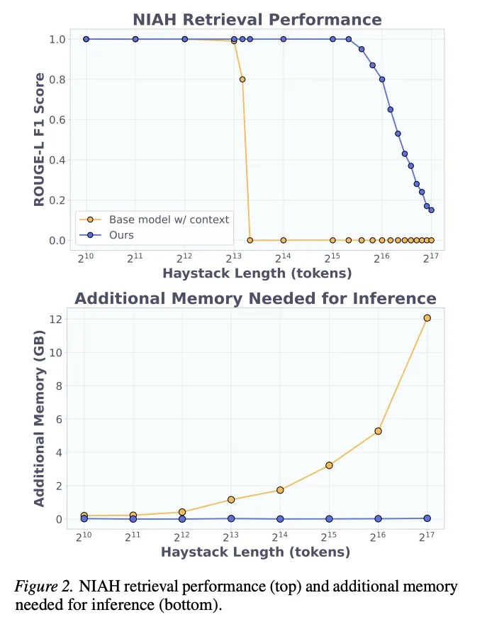 结果显示,D2L在最长40K token(40个块)时仍保持接近完美的准确率,这是训练时最大块数(8块)的5倍。超过该长度后性能才开始平缓下降。而基座模型在超过8K token后准确率急剧崩塌。在显存方面,处理128K token时基座模型需要超过12GB额外显存,D2L则始终低于50MB。