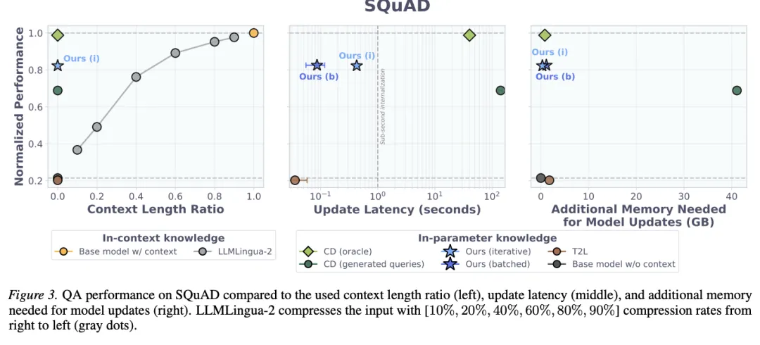 [Figure 3: SQuAD上的QA性能、更新延迟与额外显存] D2L在所有参数内知识基线中表现最优,在SQuAD上达到基座模型ICL上界的82.5%相对性能;更新延迟低于1秒,而CD(oracle)约40秒,带生成查询的CD超过100秒。