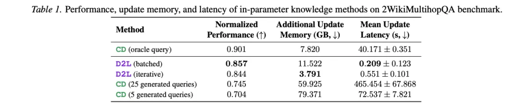 [Table 1: 2WikiMultihopQA上参数内知识方法的性能、更新显存与延迟] D2L(batched模式)归一化性能0.857,更新延迟仅0.209秒;CD(5个生成查询)性能0.704,延迟72.5秒,显存79.4GB。