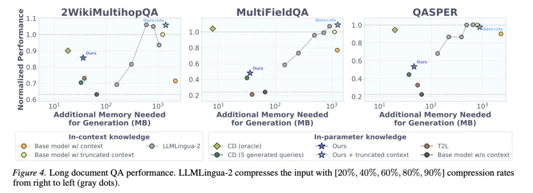 论文在6个真实QA基准上评估D2L,包括短文本任务SQuAD、DROP、ROPES,以及LongBench中的长文档任务2WikiMultihopQA、MultiFieldQA、QASPER。评估指标为词级ROUGE-L F1分数(相对于基座模型直接读取上下文的性能归一化)。
