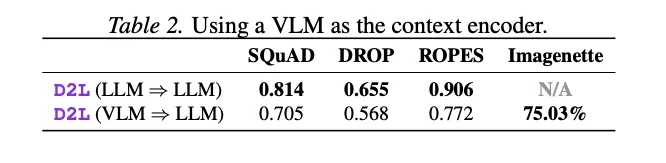 [Table 2: 使用VLM作为上下文编码器的结果] VLM到LLM的跨模态D2L在Imagenette上达到75.03%准确率,文本QA性能有所下降但仍可用。