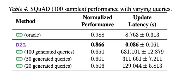 [Table 4: SQuAD上不同查询数的CD与D2L对比] D2L性能0.866,延迟0.086秒;CD(100个查询)性能0.650,延迟631秒。