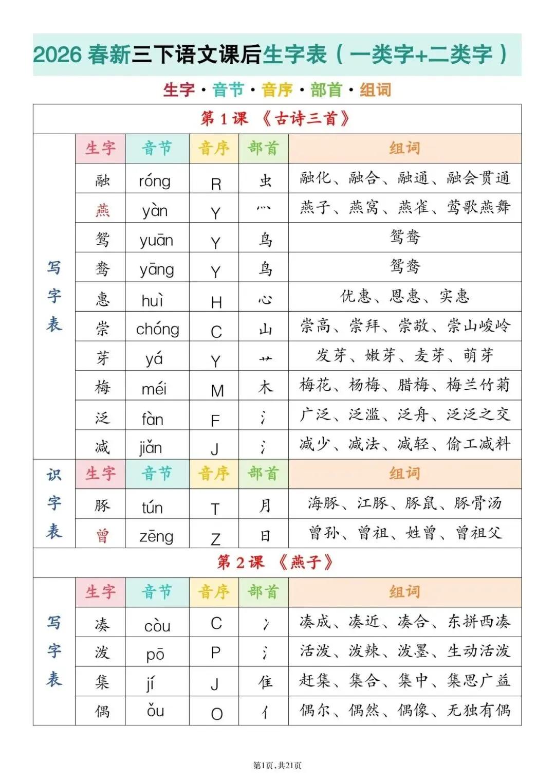 2026春最新版.三年级下册语文课后生字组词(含一类字+二类字+词语表)可打印 大家好,我是陈佳妈妈,今天分享的是 2026春最新版.三年级下册语文课后生字组词(含一类字+二类字+词语表)电子版可打印 (温馨提示;因篇幅有限,仅展示部分内容。 (文末有完整版电子版领取方式) 完整电子版: ①:在公众号对话框中回复:2290 (不是在“留言”中发数字)
