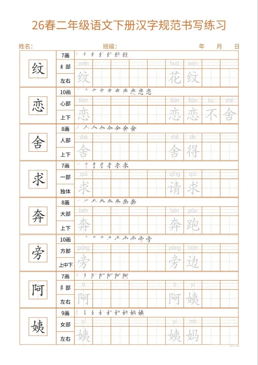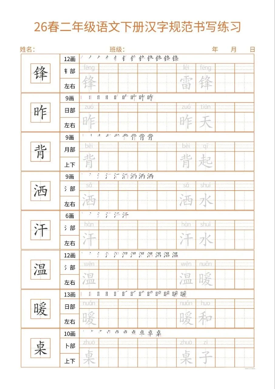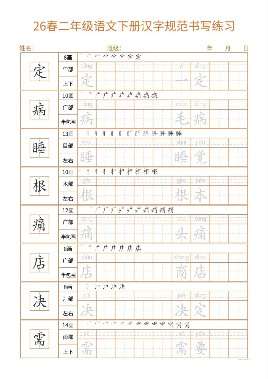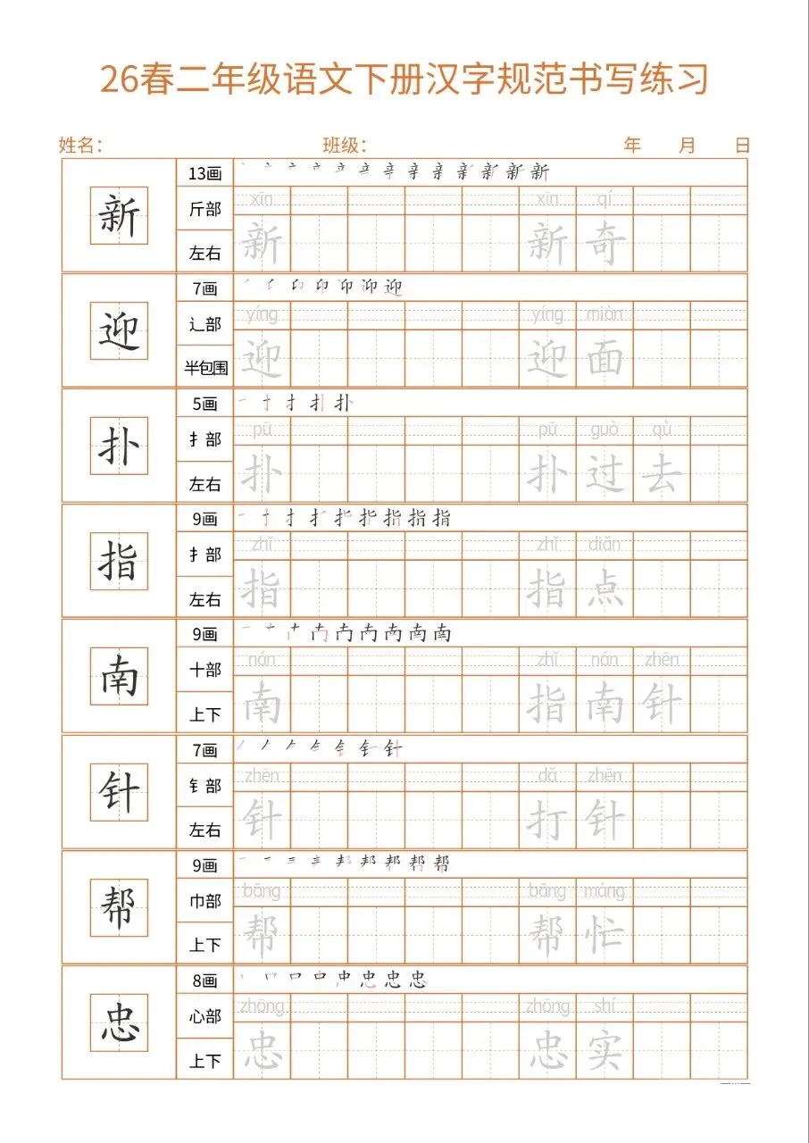 这份26春二下语文书写练习同步教材核心生字,每字标注笔画、部首、结构及组词,笔顺示范直观。32页按每日一练编排,排版简洁、练习空间充足,适配二年级学情。兼顾汉字规范书写与词汇积累,能夯实基础、纠正笔顺,非常适合课堂练习与课后巩固,是低学段语文书写训练的实用好帮手。