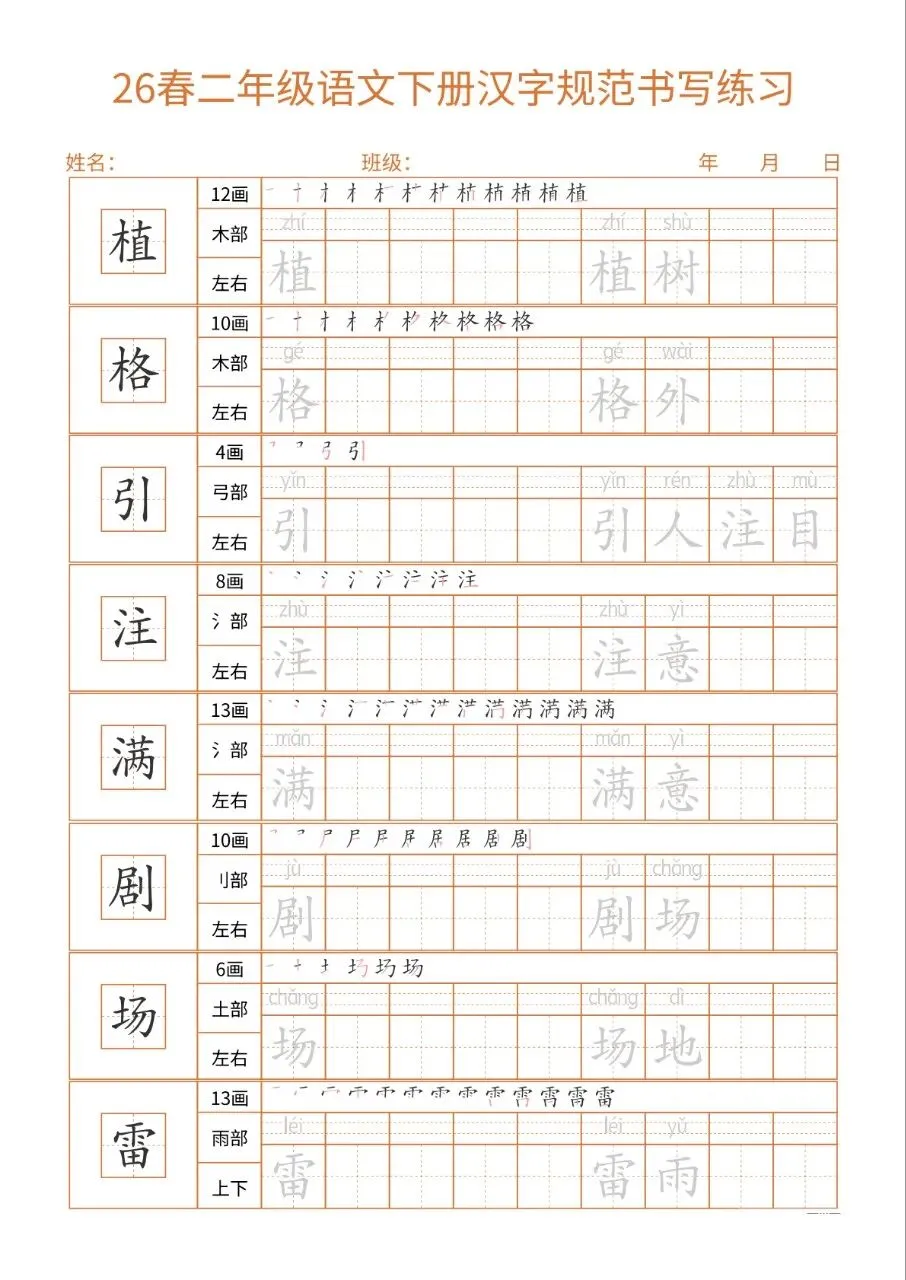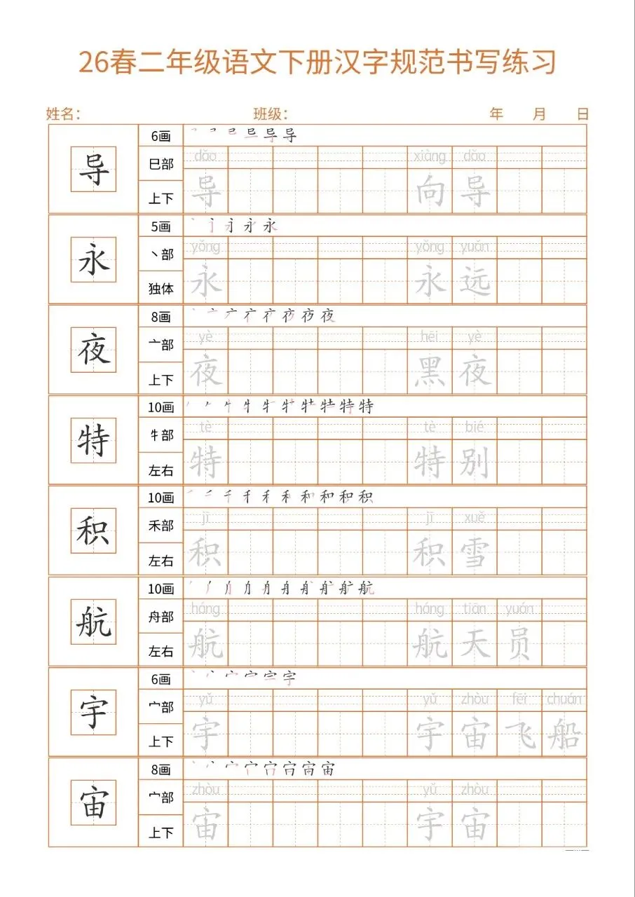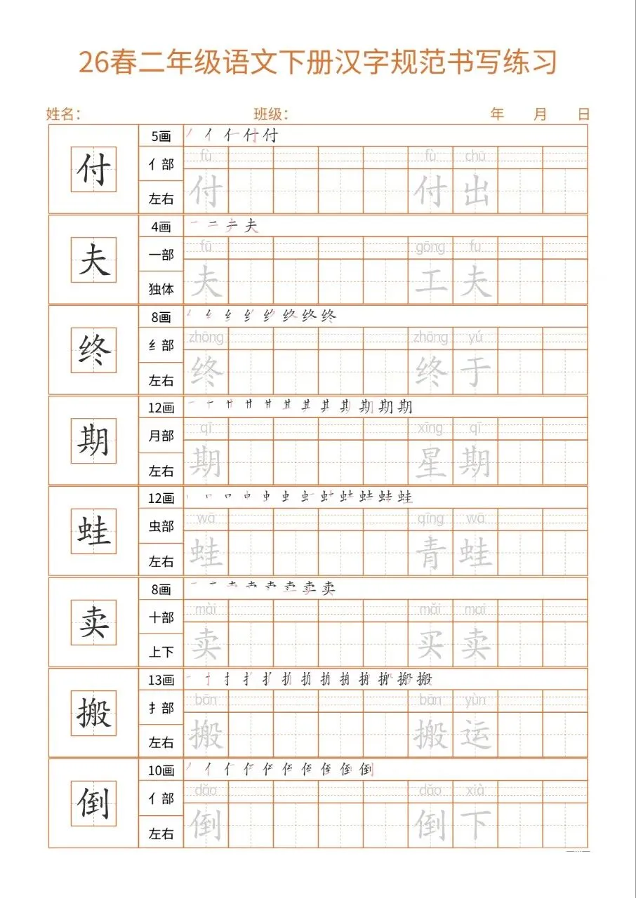 这份26春二下语文书写练习同步教材核心生字,每字标注笔画、部首、结构及组词,笔顺示范直观。32页按每日一练编排,排版简洁、练习空间充足,适配二年级学情。兼顾汉字规范书写与词汇积累,能夯实基础、纠正笔顺,非常适合课堂练习与课后巩固,是低学段语文书写训练的实用好帮手。