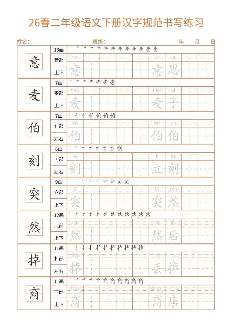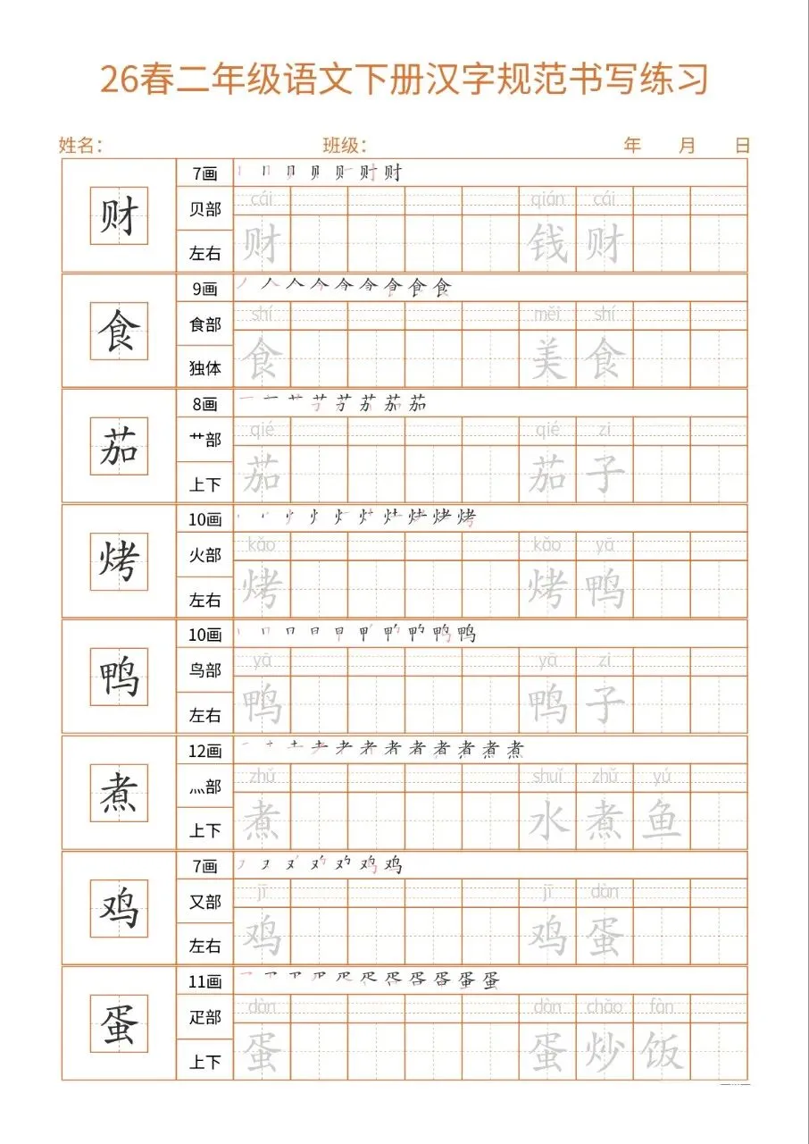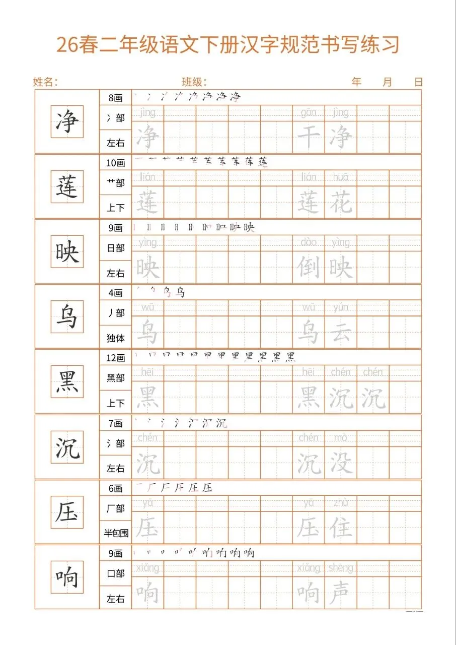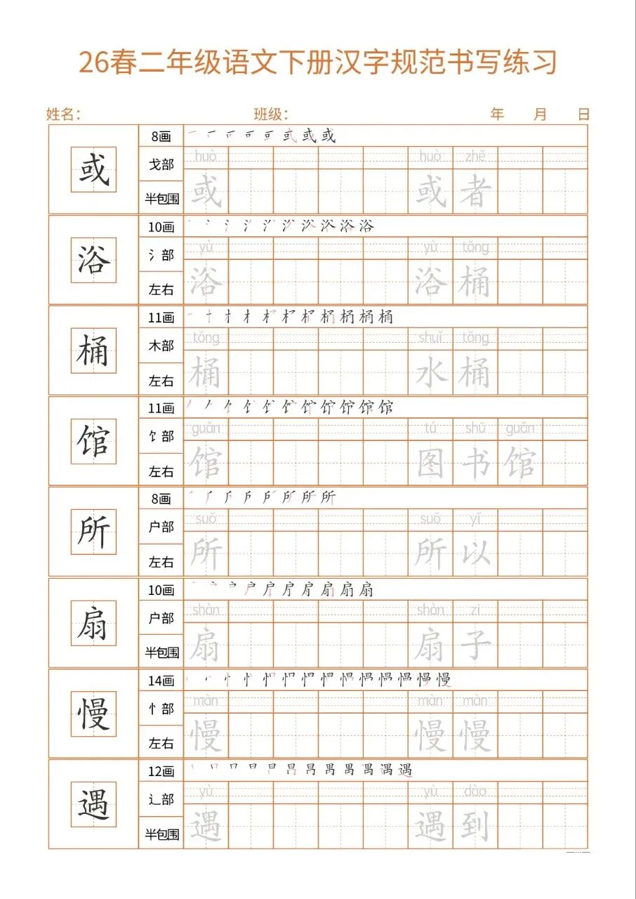 这份26春二下语文书写练习同步教材核心生字,每字标注笔画、部首、结构及组词,笔顺示范直观。32页按每日一练编排,排版简洁、练习空间充足,适配二年级学情。兼顾汉字规范书写与词汇积累,能夯实基础、纠正笔顺,非常适合课堂练习与课后巩固,是低学段语文书写训练的实用好帮手。