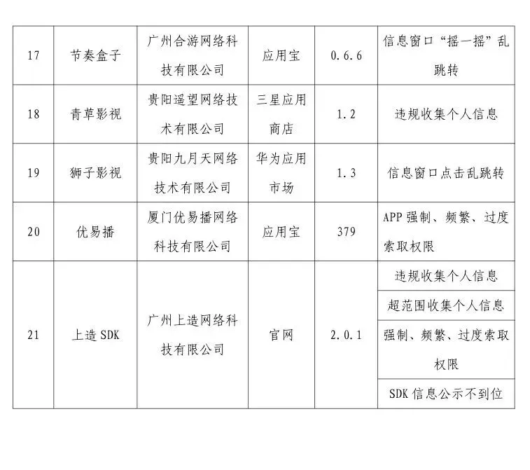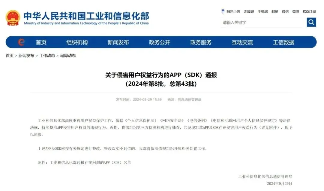 工业和信息化部高度重视用户权益保护工作,依据《中华人民共和国个人信息保护法》《中华人民共和国网络安全法》《电信条例》《电信和互联网用户个人信息保护规定》等法律法规,持续整治APP侵害用户权益的违规行为。近期,我部组织第三方检测机构进行抽查,共发现21款APP及SDK存在侵害用户权益行为(详见附件),现予以通报。