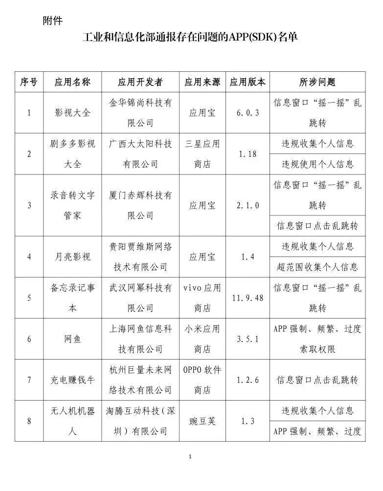 附件:工业和信息化部通报存在问题的APP(SDK)名单