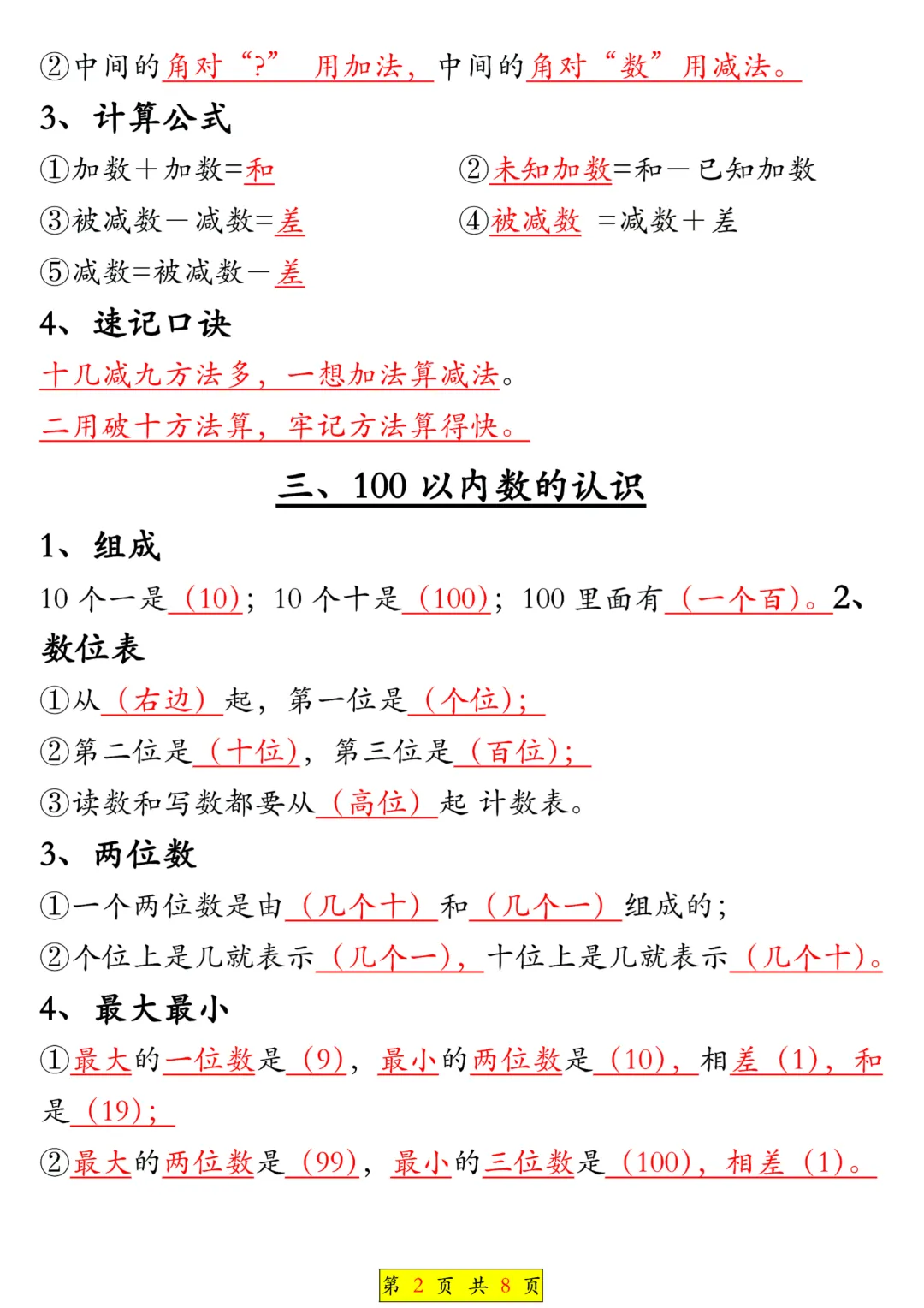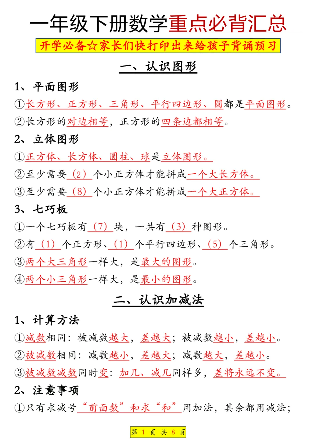 一年级(下)数学 全册知识点汇总电子版PDF,8页,免费下载