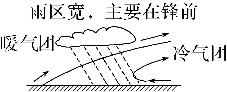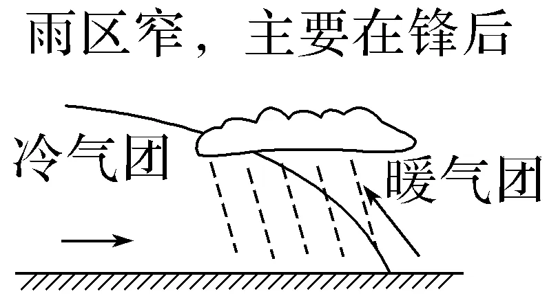 (5)定锋面雨带:无论冷锋还是暖锋,锋面雨带出现在冷气团控制一侧及低压中心区域。