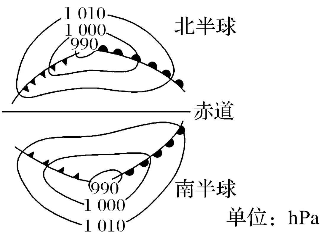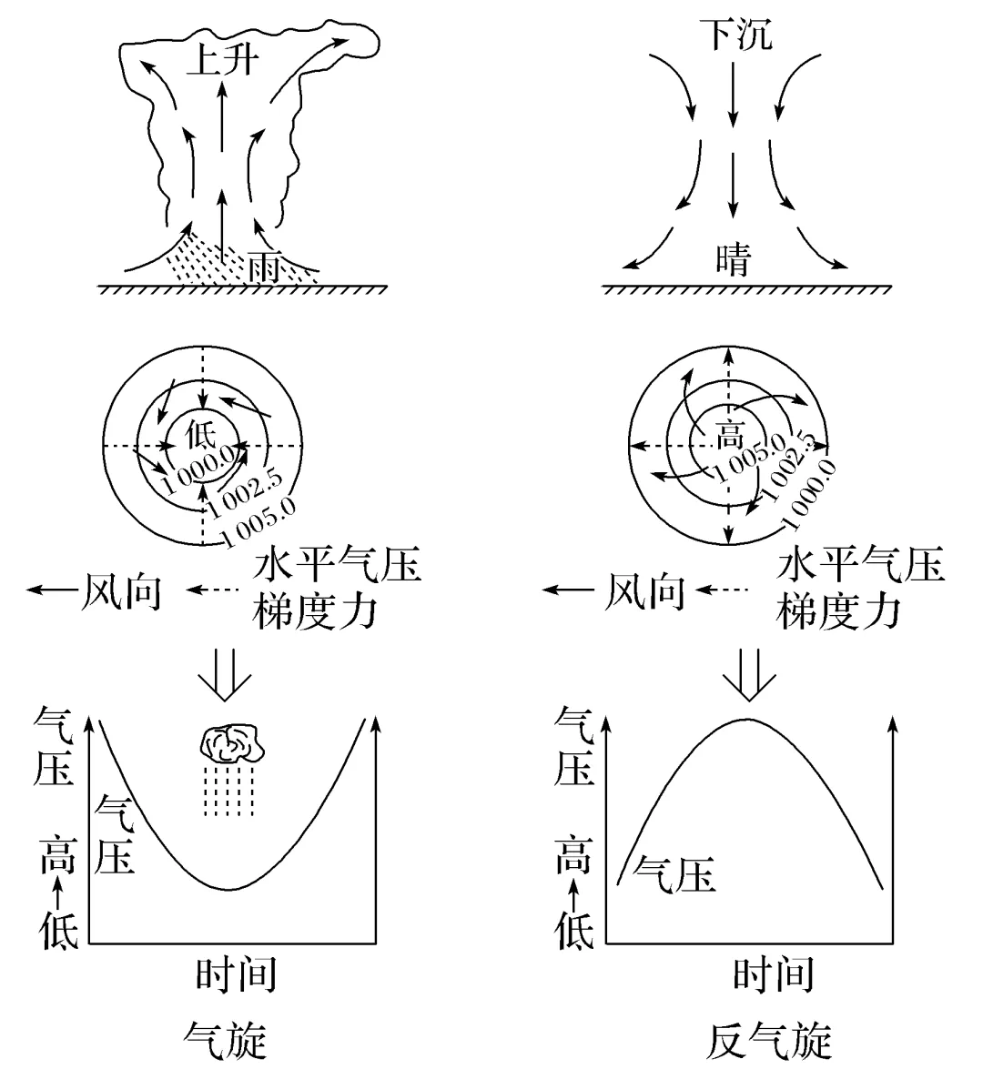 (2)气旋与反气旋的形成原理与天气特征(以北半球为例,单位:hPa)