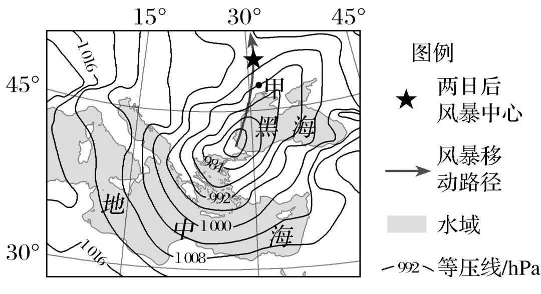(2024·1月浙江卷,16~17)2023年某日,一场源自地中海的风暴席卷黑海北岸,给甲地带来强降水。如图为该日某时刻的天气形势图。完成1~2题。