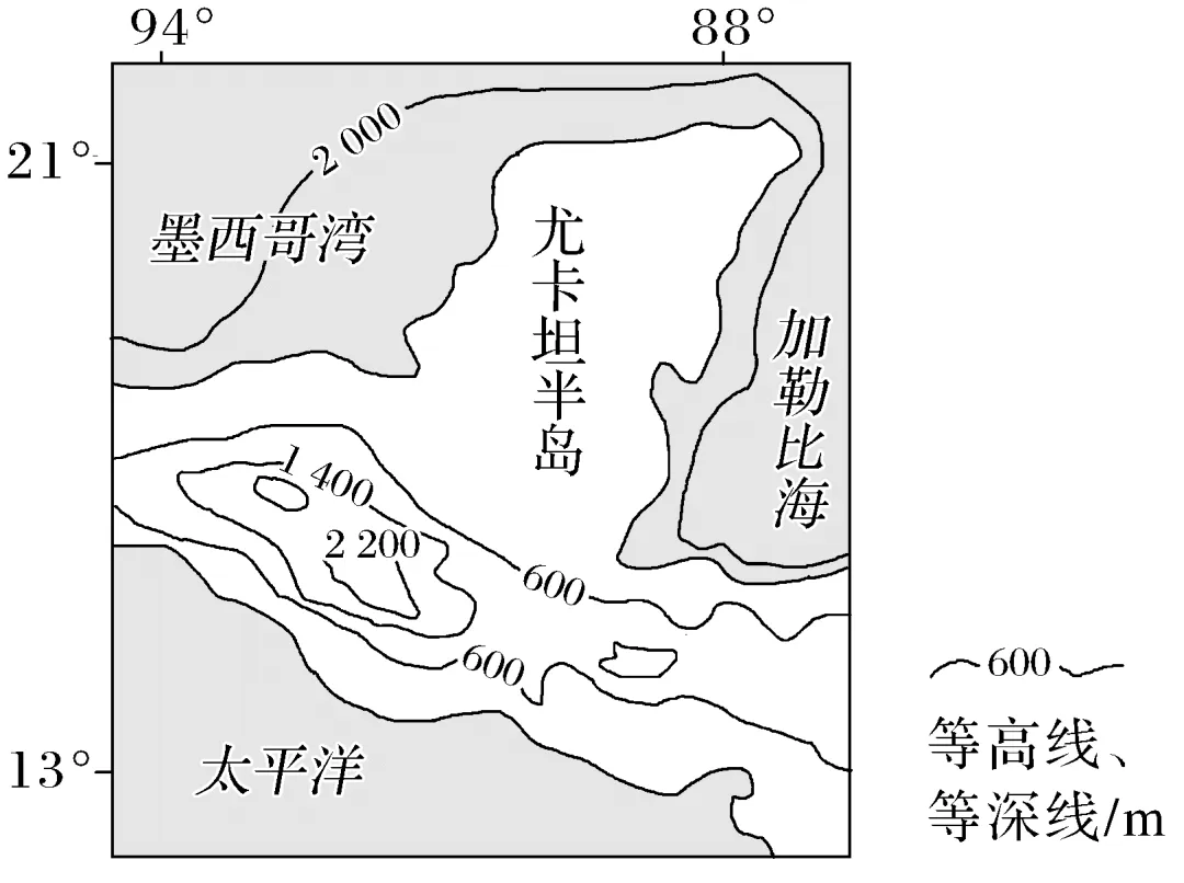 (2024·山东泰安一模)尤卡坦半岛终年受信风带控制,东海岸海风更强,西海岸陆风更强。尤卡坦半岛某海岸海风登陆时,遇到陆地上稳定的信风,徘徊不前时,就会形成海风锋,为沿海地区带来一定的降水。一般情况下,温度相同时湿空气要比干空气密度小。如图示意尤卡坦半岛位置和地形。据此完成4~5题。