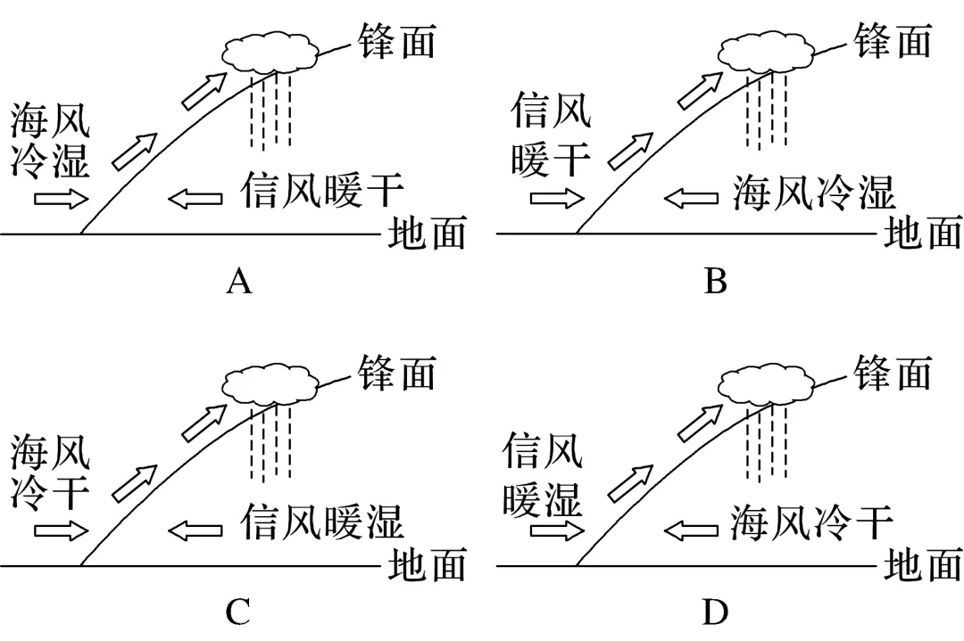 解析 根据材料“一般情况下,温度相同时湿空气要比干空气密度小”可知,海风性质冷湿,东北信风性质暖干,海风潮湿,密度小,气团轻,在锋面之上;信风干燥,密度大,气团重,在锋面之下,选A。
