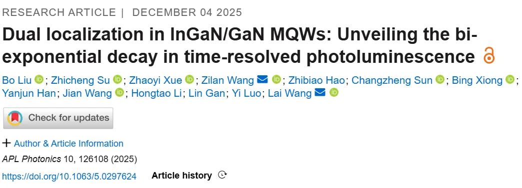 该成果以“Dual localization in InGaN/GaN MQWs: Unveiling the bi-exponential decay in time-resolved photoluminescence”为题,发表于《APL Photonics》,清华大学博士生刘波和东南大学副教授苏志成为论文的共同第一作者,清华大学汪莱教授和大连理工大学王子兰副教授为论文的共同通讯作者。