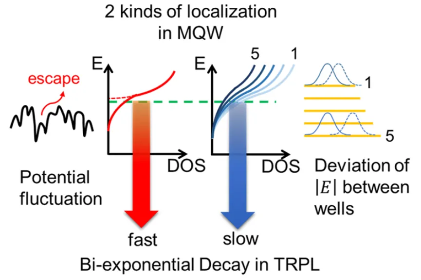 本文提出了一种在InGaN/GaN多量子阱中由“能量局域化”和“电场局域化”共同作用导致的载流子双指数衰减新机制。通过对比多量子阱和单量子阱的TRPL衰减曲线发现,单量子阱呈单指数衰减,而多量子阱必须用双指数衰减模型拟合,这表明多量子阱中存在额外的局域化机制。能量局域化源于铟组分波动导致的势能涨落,使载流子局域于不同深度的能量势阱,这决定了TRPL光谱中的快寿命;而电场局域化则源于各量子阱间极化电场的差异,导致电子和空穴波函数重叠度不同,从而复合速率各异,其分布决定了TRPL光谱中的慢寿命。