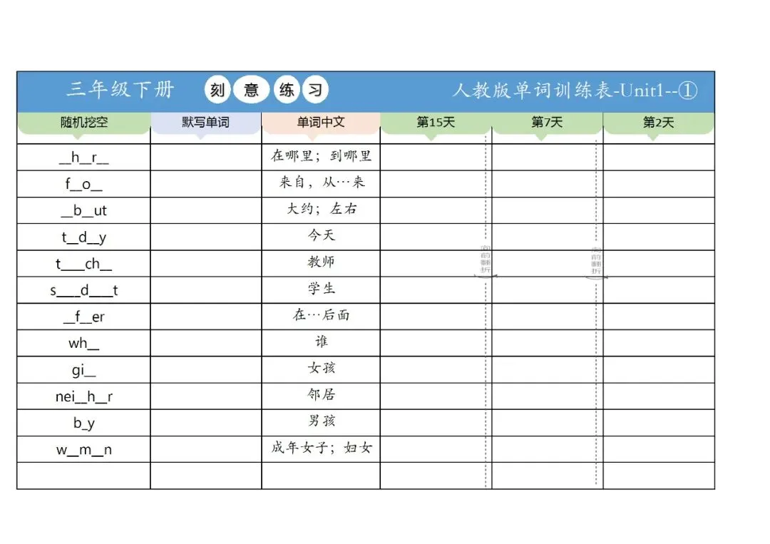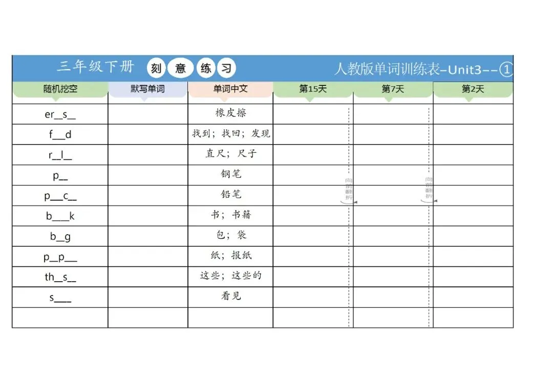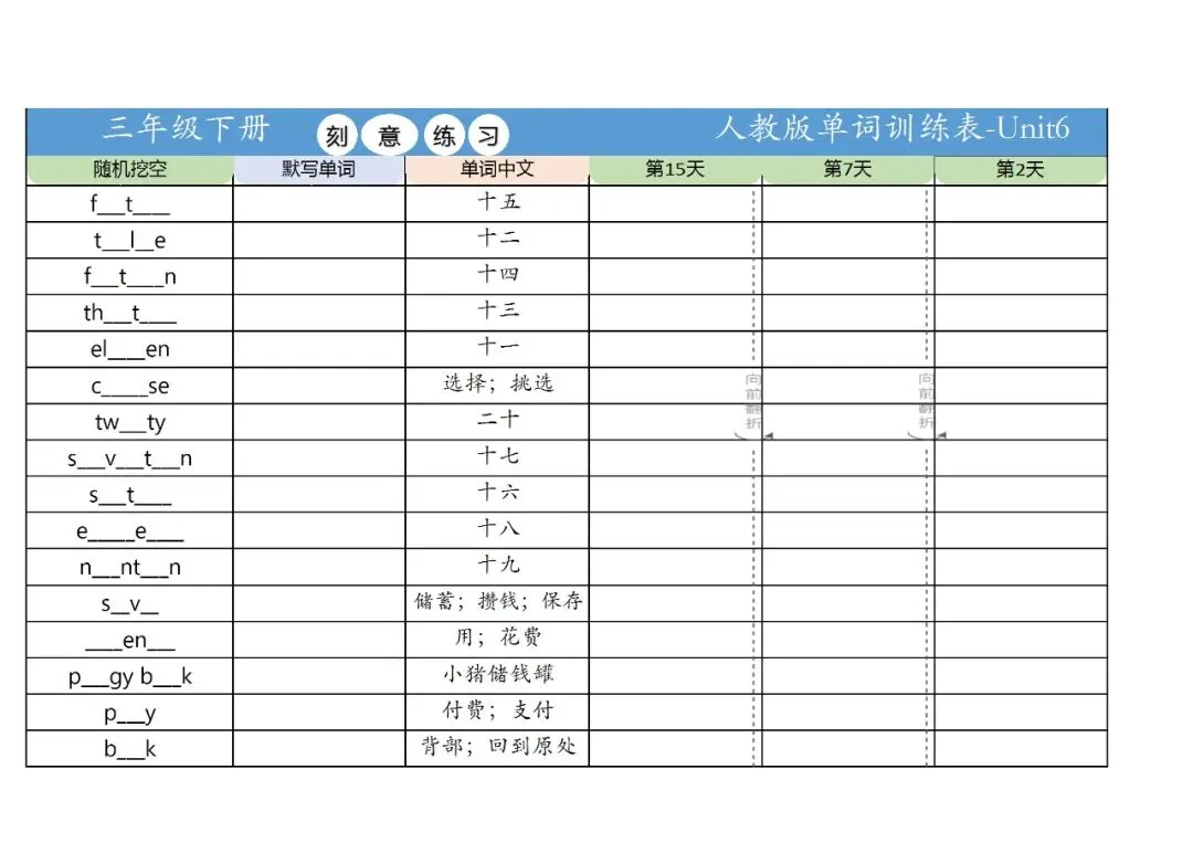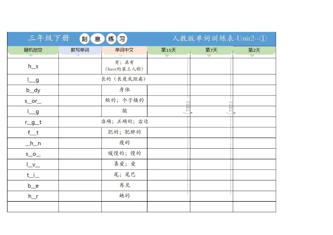新三年级英语下册全册单词训练表,免费下载