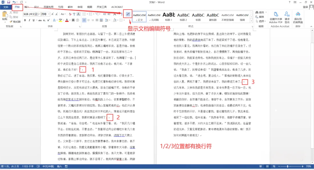 这时,可能会看到段落末尾有向下箭头形状的换行符。这些换行符意味着段落只是进行了简单的换行,并非真正意义上的另起一段,所以首行缩进格式自然就无法应用了。