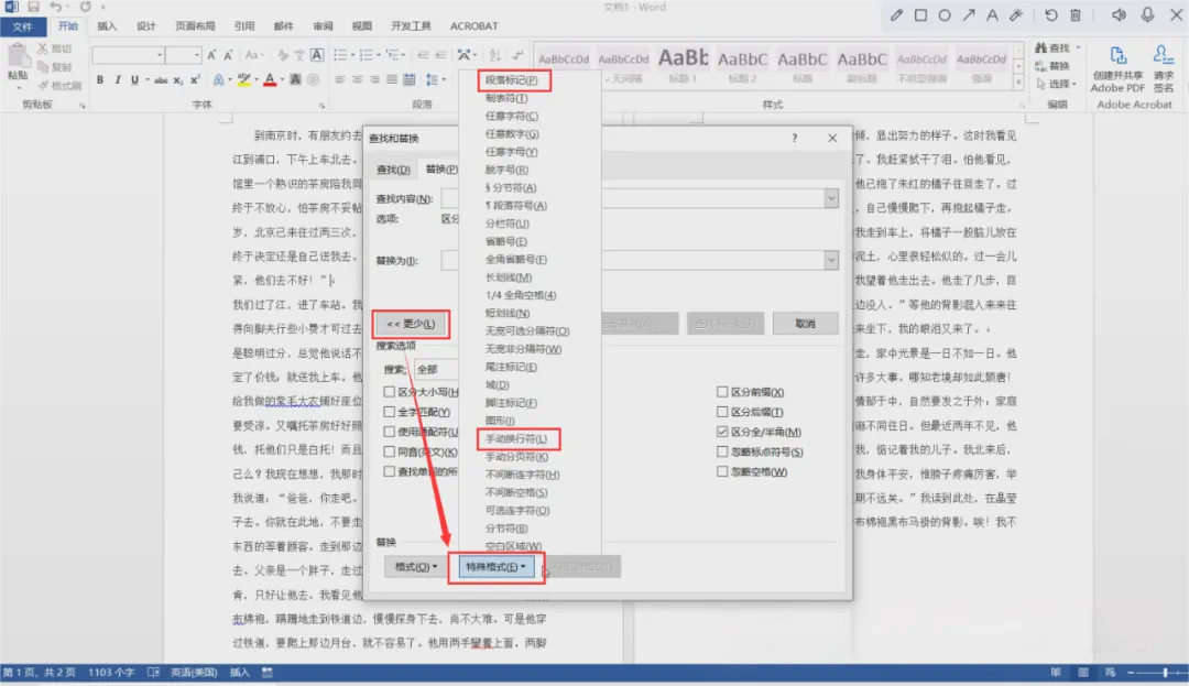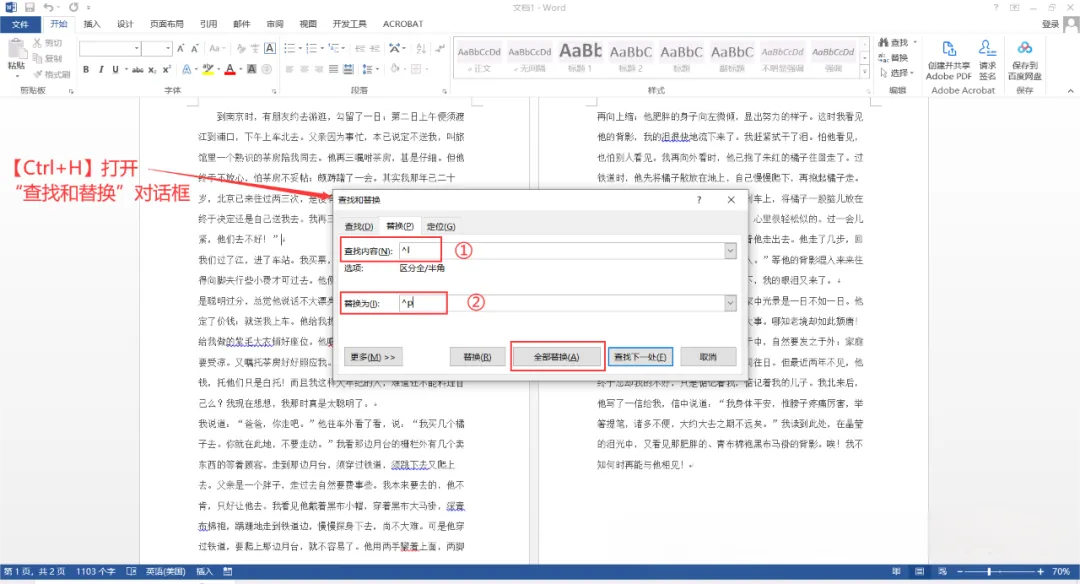 最后,点击“全部替换”按钮,将所有手动换行符都替换为段落标记。
