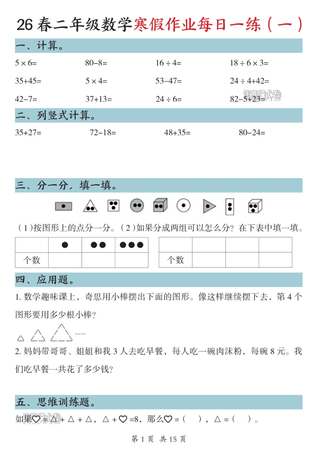 【免费下载】二年级数学寒假作业每日一练 电子版