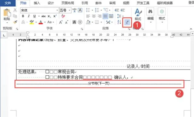 为了验证这一判断,我们单击【段落】功能组中的【显示/隐藏编辑标记】命令,可以看到,在该文档第一页末尾多出了一个分节符(下一页)符号,果然是分节符在作怪!