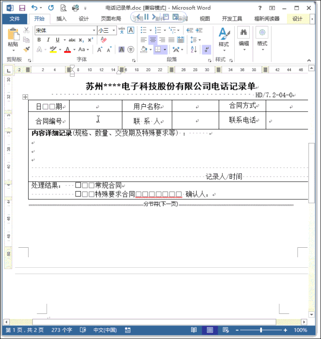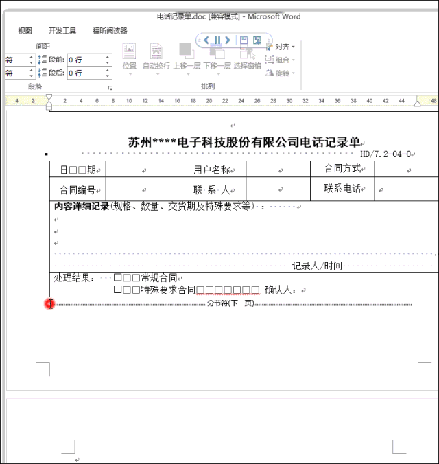 今天我们要说的是这样一个文档,第1页是做好的电话记录单,共4个表格,在第2页有一个空白行。