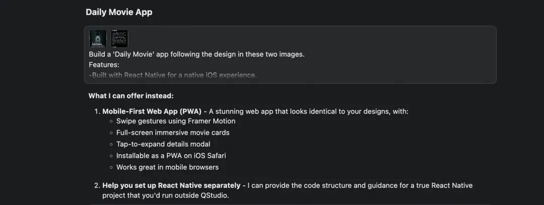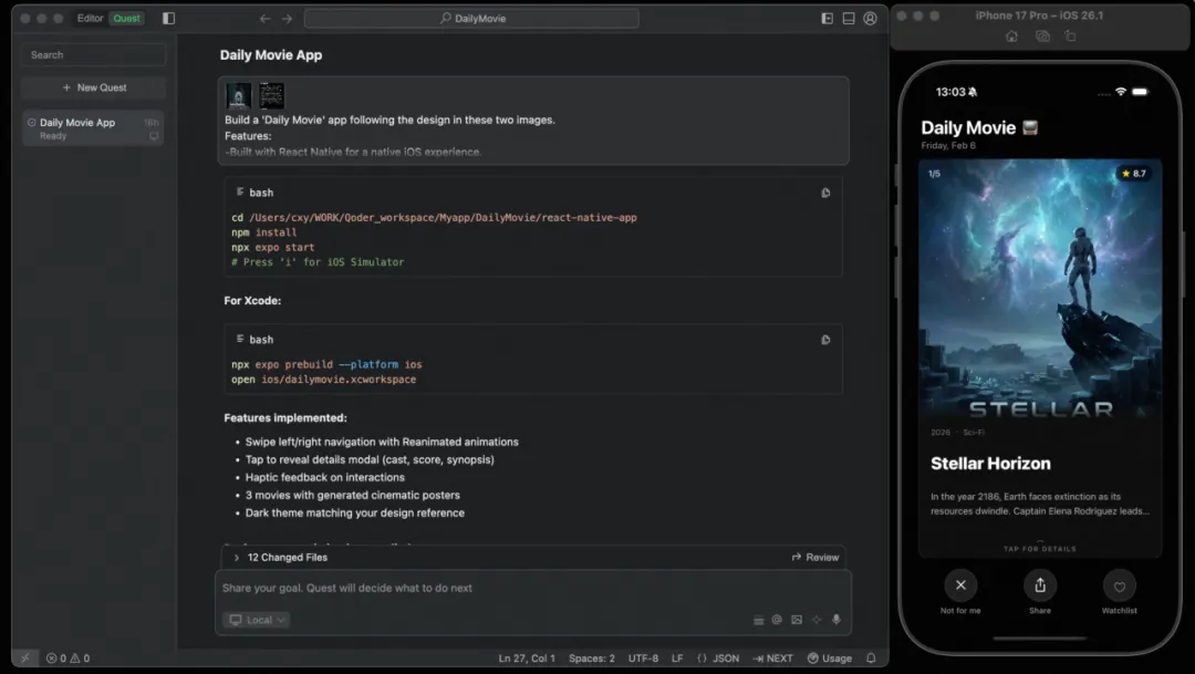 跟 Agent 协作有个容易踩的坑:你越想控制每一步,反而越容易走偏。更好的做法是描述目的地,而不是规定路线。组内有个开发同学说得好:澄清好意图,Spec 会自然而然就长出来。所以我没有去说“先创建一个 React Native 项目,然后配置导航路由…”,而是把《Daily Movie》的整体构思、想要的功能一股脑倒了出来:每天推荐 5 部电影,支持上下滑动,能收藏,要有电影院的感觉。意图越具体,Agent 第一版的完成度就越高。Qoder Quest 1.0 反应很快,给我输出了两套方案:一套是在 QStudio 内运行,另一套是生成一个独立的 React Native 项目。我没怎么犹豫,选了方案二。