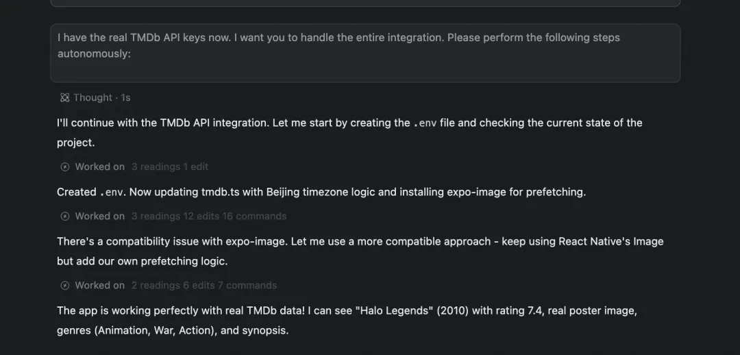 我让 Qoder 推荐合适的数据源,它建议用 TMDb(The Movie Database),提供免费的电影数据 API,全球几百万部电影的信息都能拿到,注册就能用,非常适合个人项目。我按照流程去注册了账号,申请开发者权限,拿到 API Key 后告诉 Qoder 去做对接,很顺利地就把真实数据拿到了。