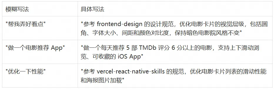 功能细节调完之后,我发现一个问题:App 在快速滑动切换电影卡片的时候,偶尔会有一点点卡顿,海报图片加载也不够流畅。这时候我想起之前装 frontend-design 的经验,去 Skills 里找了找,发现有一个叫 vercel-react-native-skills 的 Skill,是 Vercel 团队出的 React Native 和 Expo 最佳实践合集,专门解决移动端性能问题。