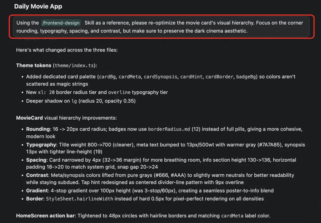 效果差别挺明显的。之前的界面像是“能用”,加了 Skill 之后的界面像是“想用”。卡片的圆角、字体层级、间距节奏都更舒服了,不再是那种千篇一律的 AI 审美。