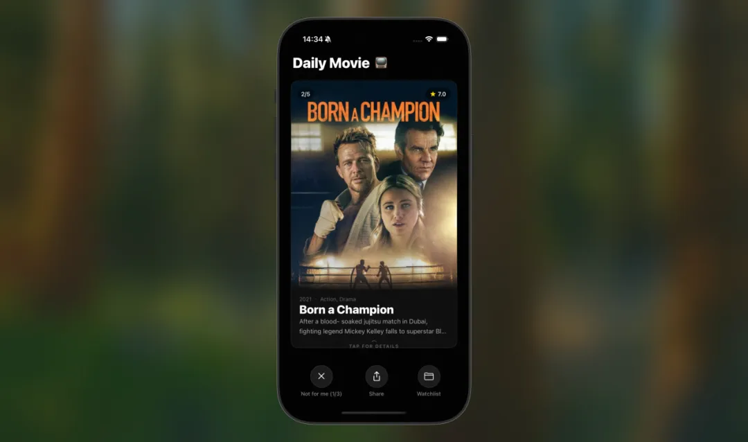 「不感兴趣」按钮: 每天推荐的 5 部电影里有不想看的?点击「Not for me」换一部。但每天只能换 3 部,次数用尽就会提示「明天再来」。这个设计是故意的,如果无限换,推荐就变成了随机播放器,”每日精选”的仪式感就没了。而且适当限制选项,反而能帮你更快做决定。对抗选择困难症,有时候少即是多。