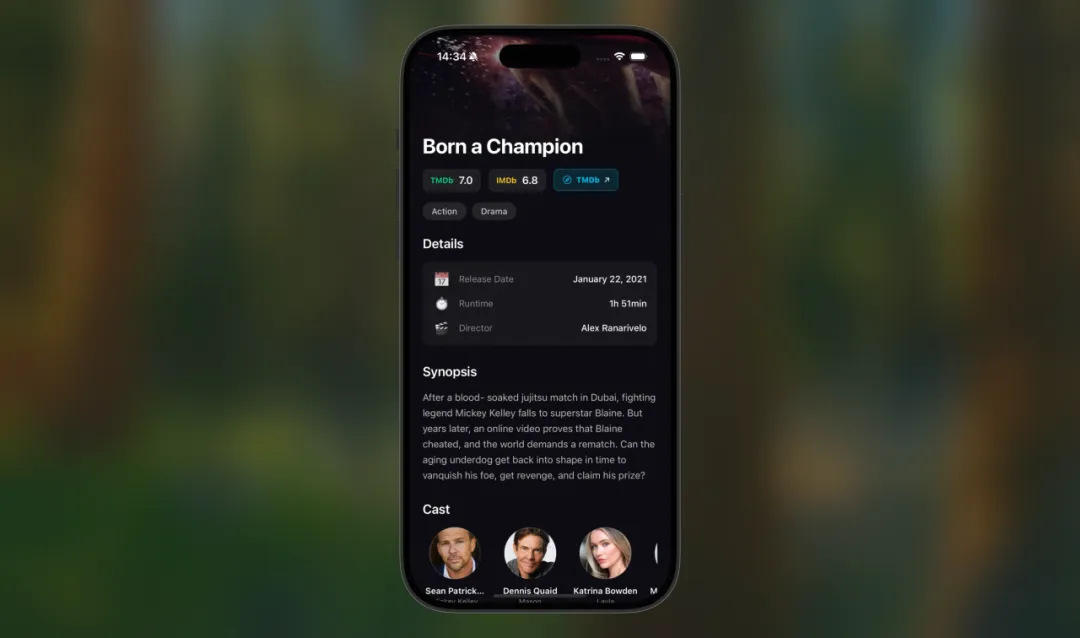 我跟 Qoder 说想要那种电影院暗场的感觉,电影卡片要大,海报是主角。因为这个 App 的核心就是看海报做决定,海报看不清整个体验就垮了。点击卡片之后能看到完整的电影信息,包括评分、导演、演员表和剧情简介,还要有收藏按钮和跳转到 TMDb 网页的链接。