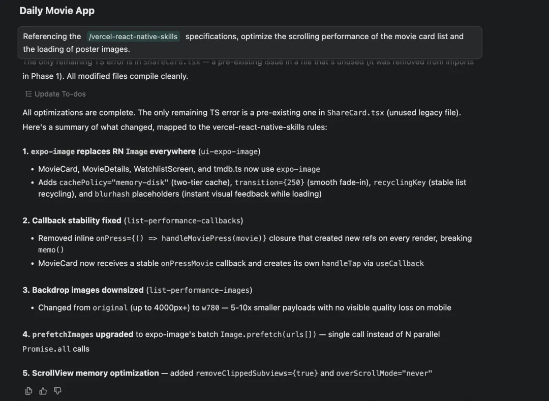 装上之后,我跟 Qoder 说:”参考 vercel-react-native-skills 的规范,优化电影卡片列表的滑动性能和海报图片加载。”
