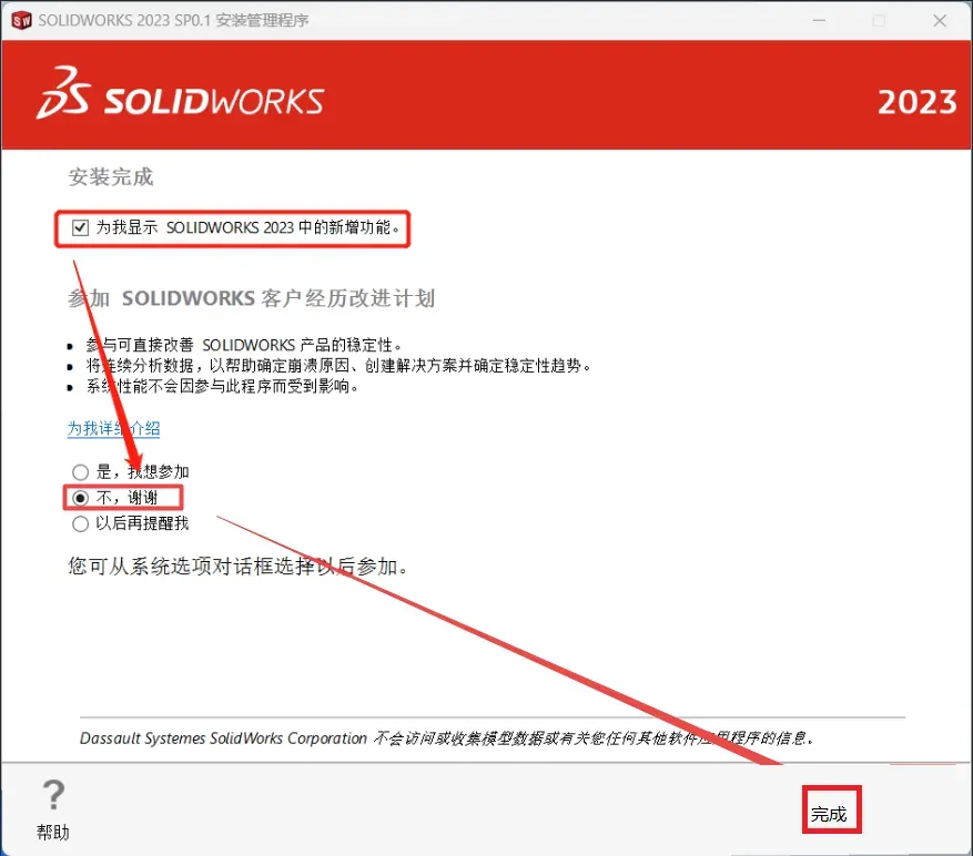 24、取消勾选“为我显示SolidWorks 2023 中的新增功能”,点选”不,谢谢”,点击”完成”(若提示重启,点击”以后重新启动“)
